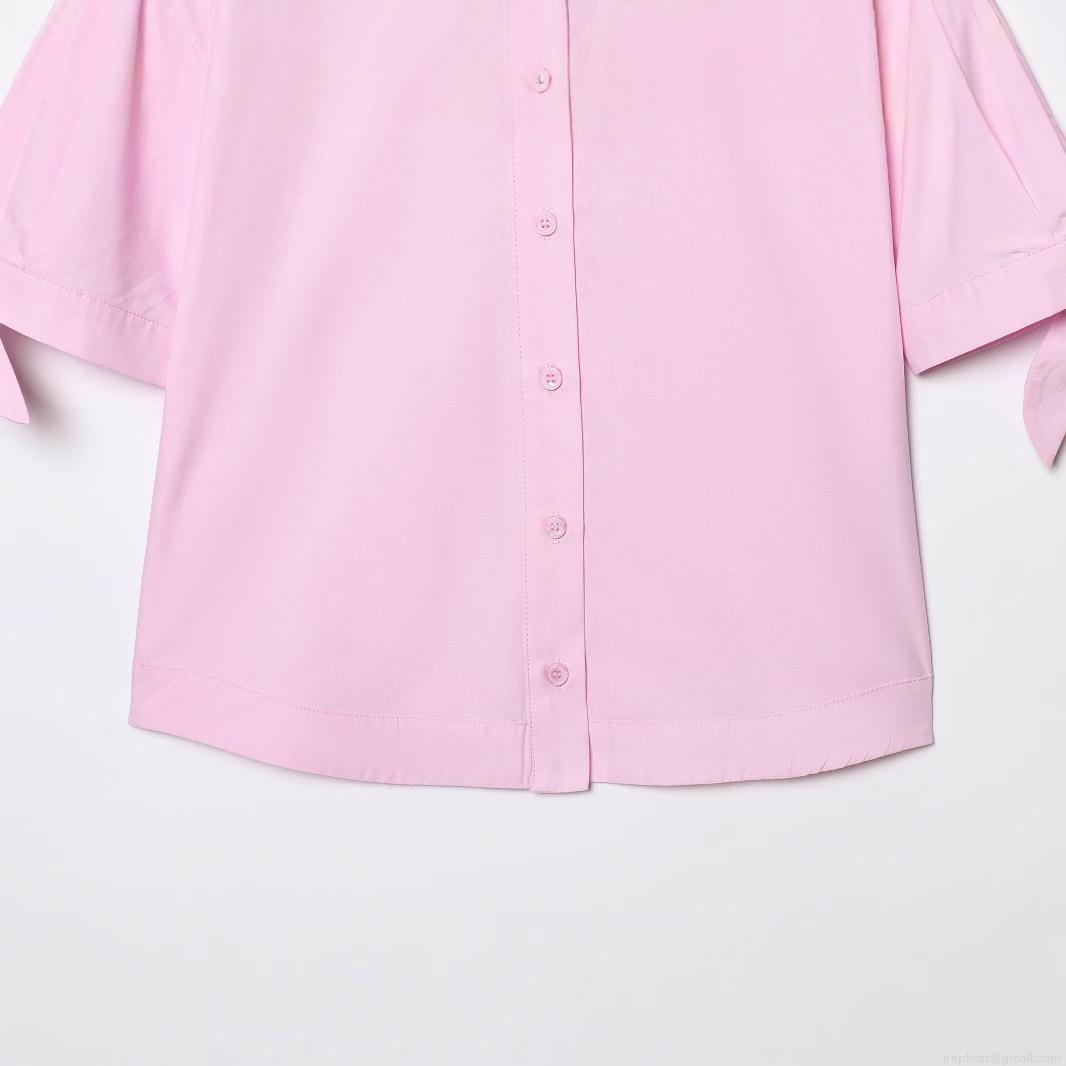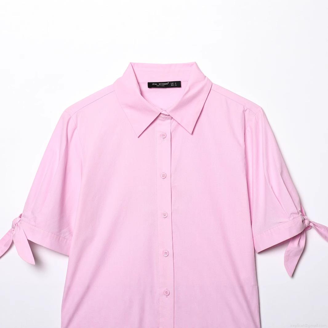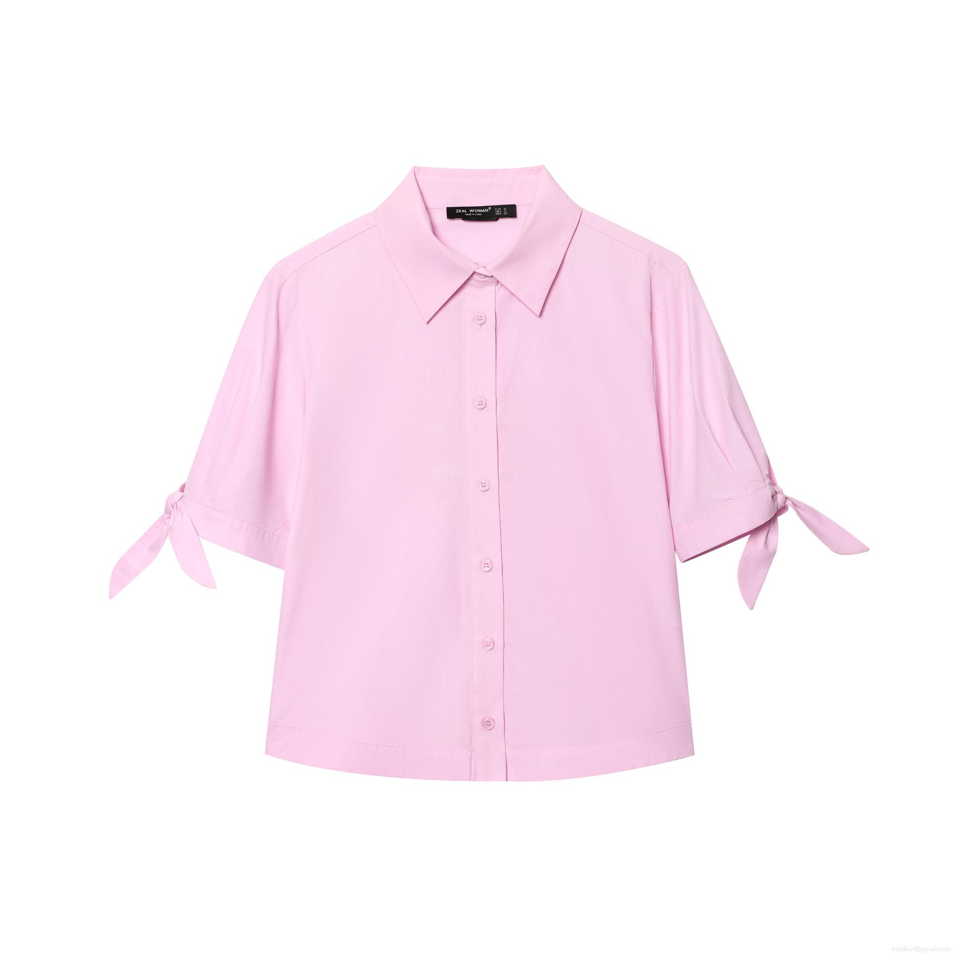 • Women's Pink Short Sleeve Blouse Shirt Lapel Button Down Top With Cuff Tie Bow Details Casual Elegant Polyester Shirt For Daily Wear