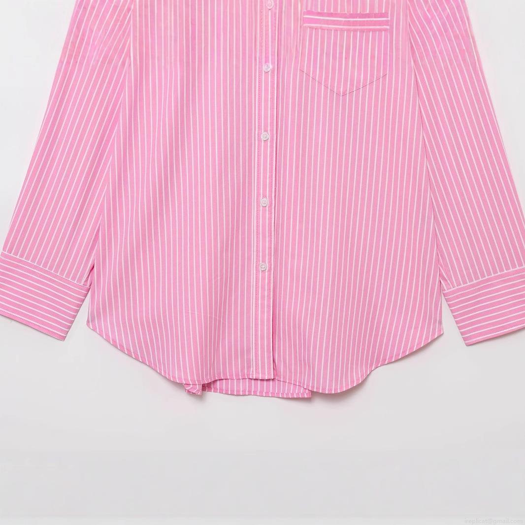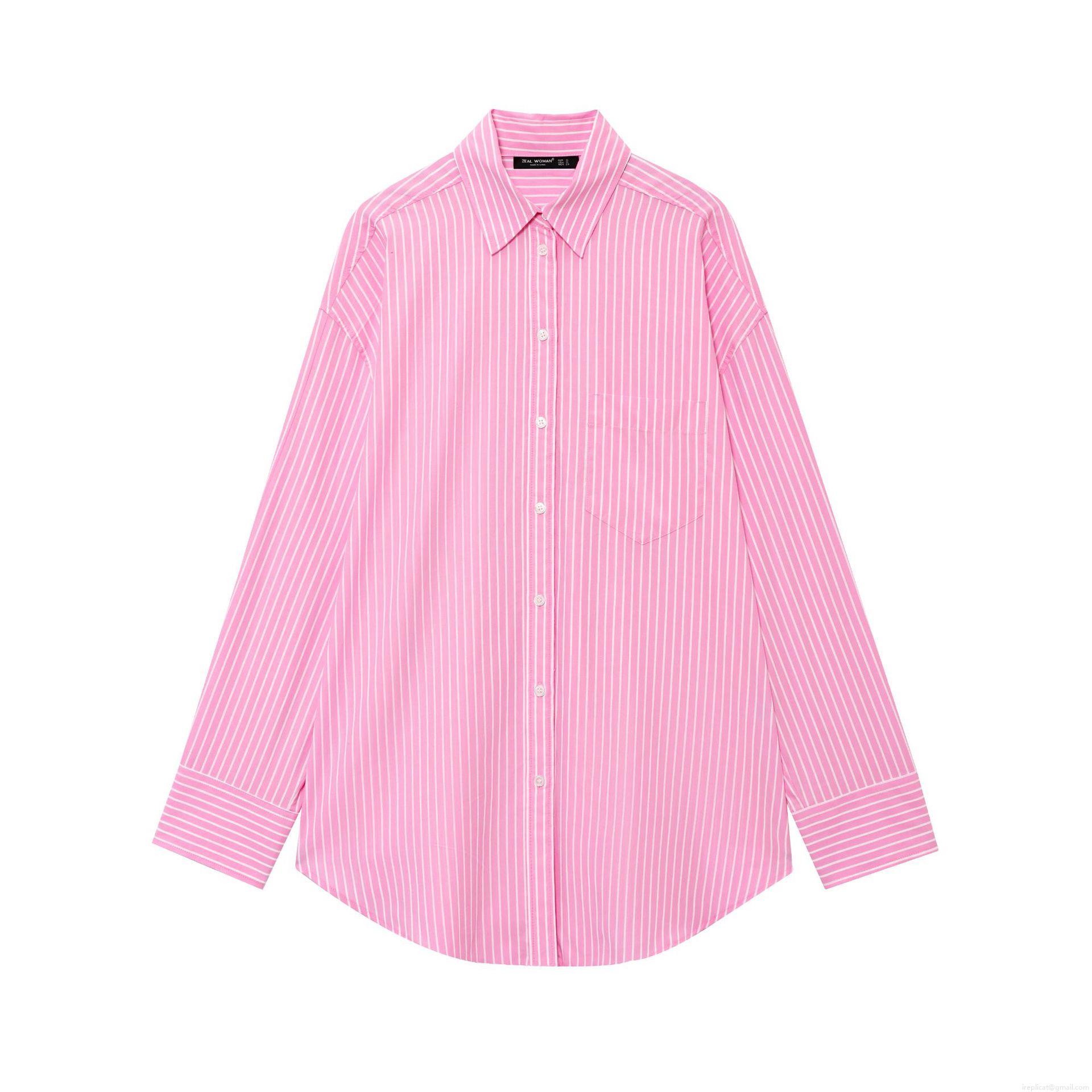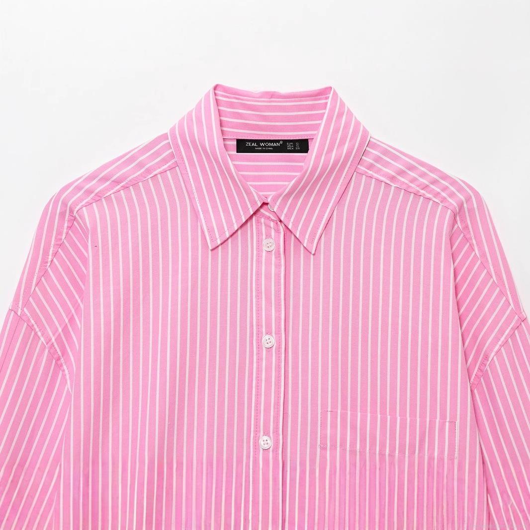 • Women's Pink Striped Button Down Long Sleeve Shirt Casual Loose Lapel Blouse With Pocket Polyester Woven Top For Women Daily Wear