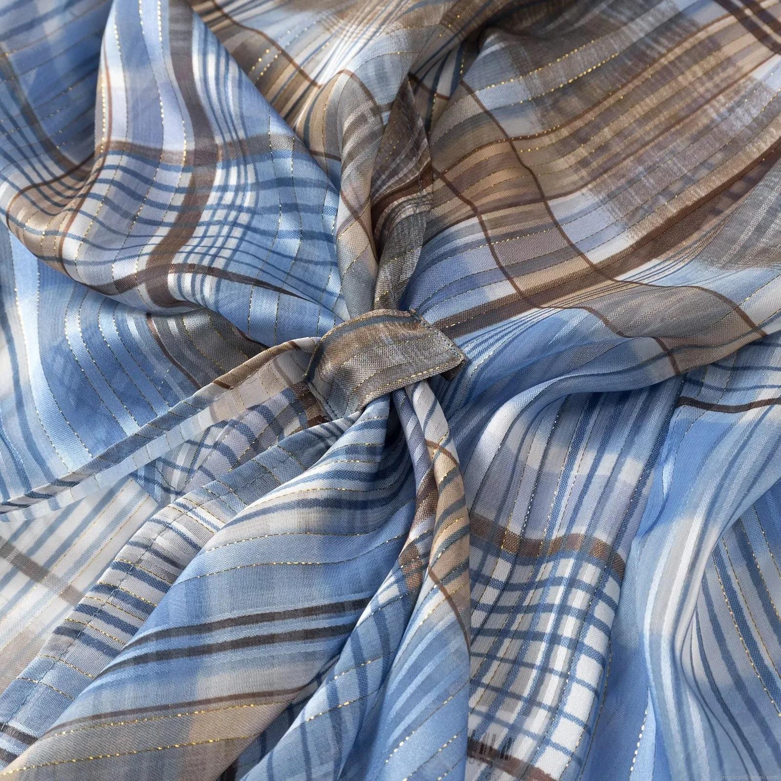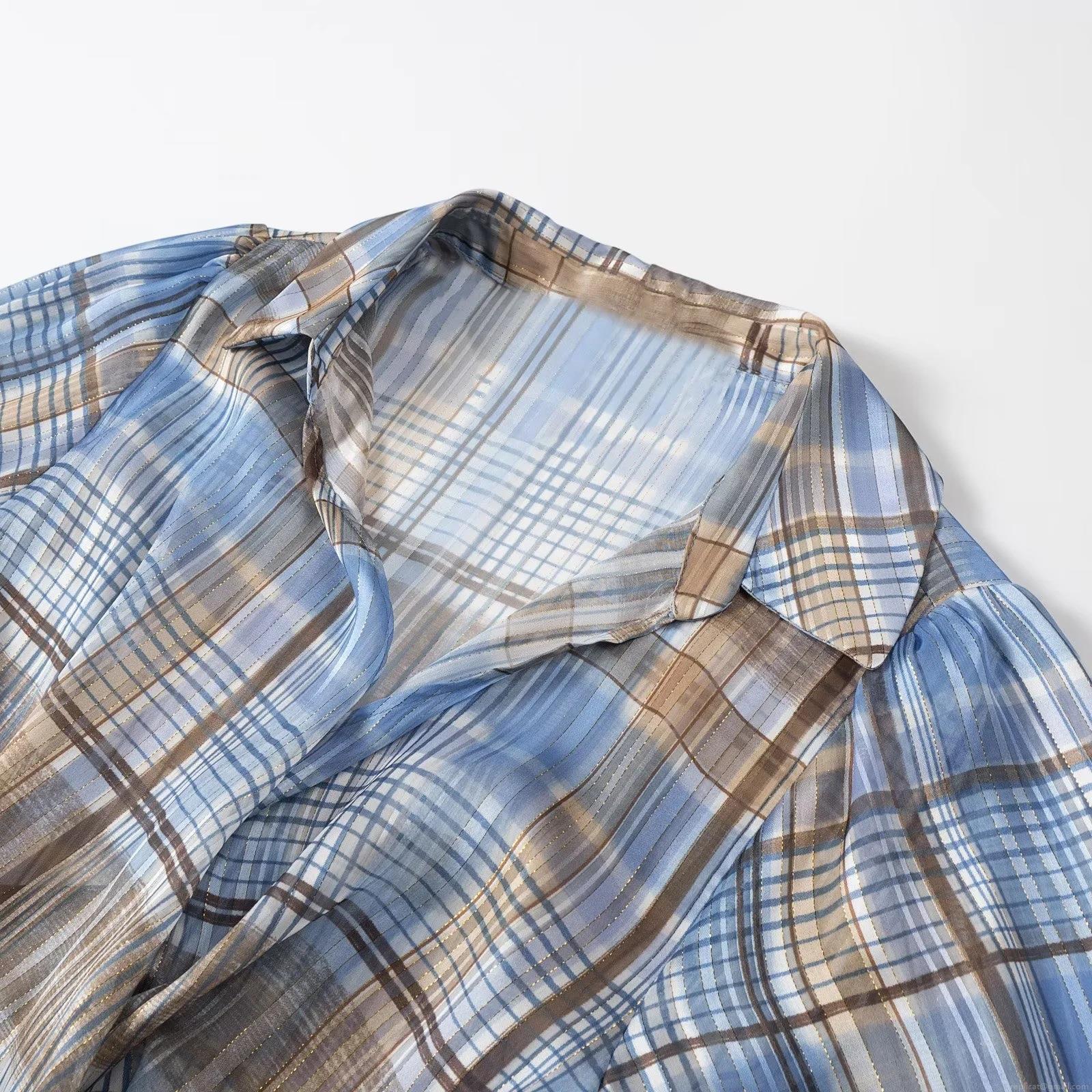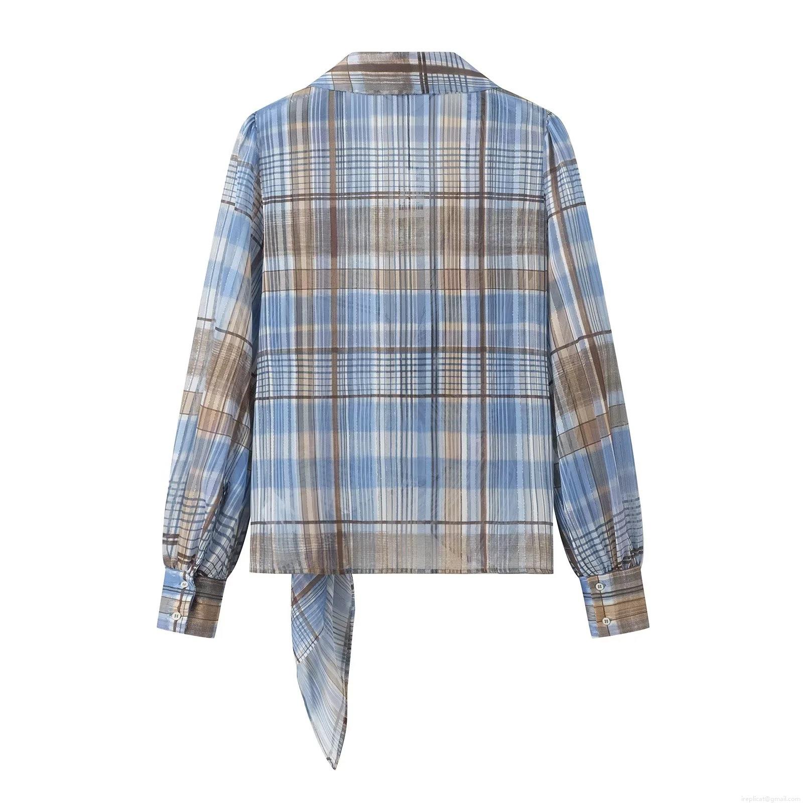 • Women's Plaid Gold Silk Long Sleeve Shirt Side Tie V-Neck Blouse Elegant Blue Brown Checkered Top With Metallic Thread For Women Daily Fashion Spring