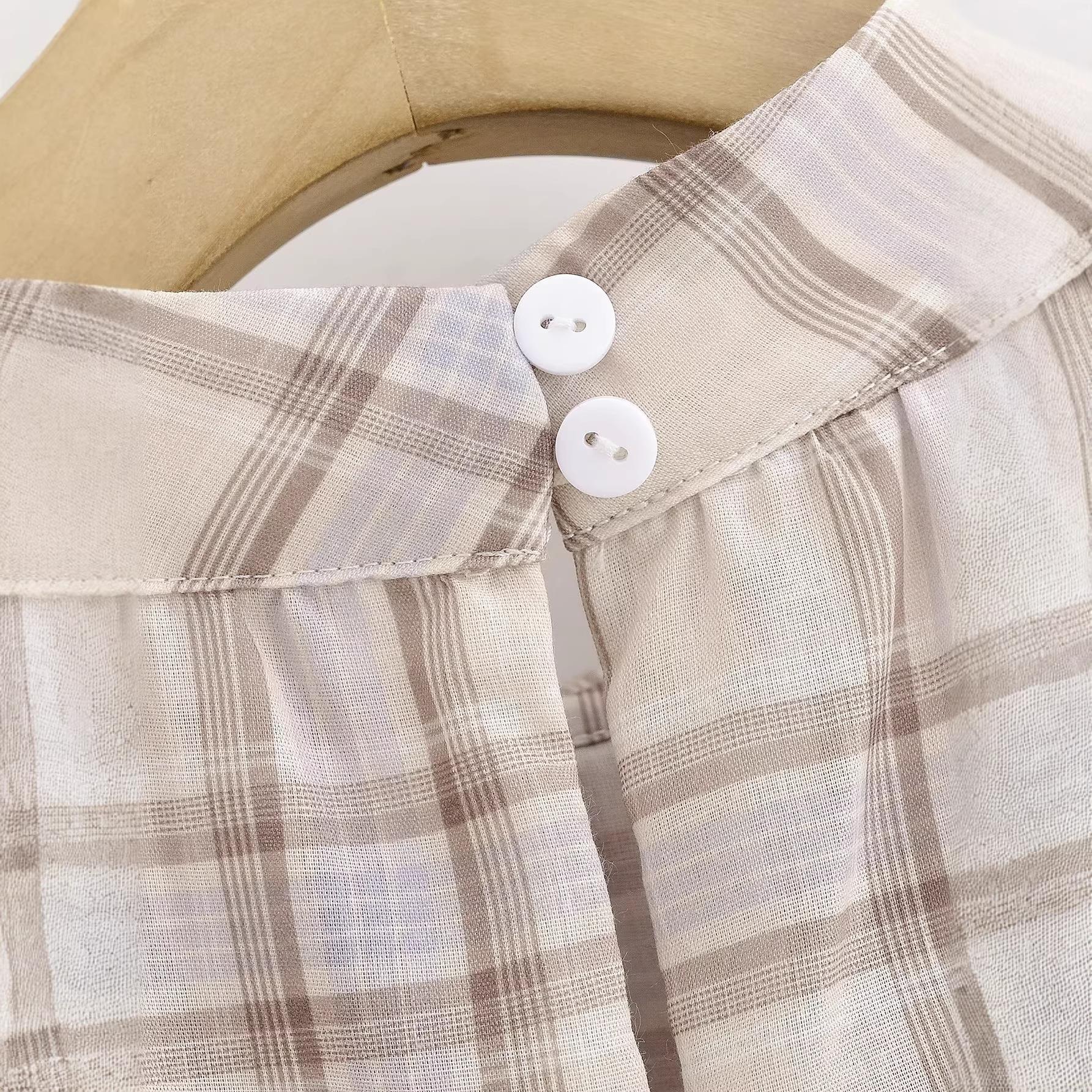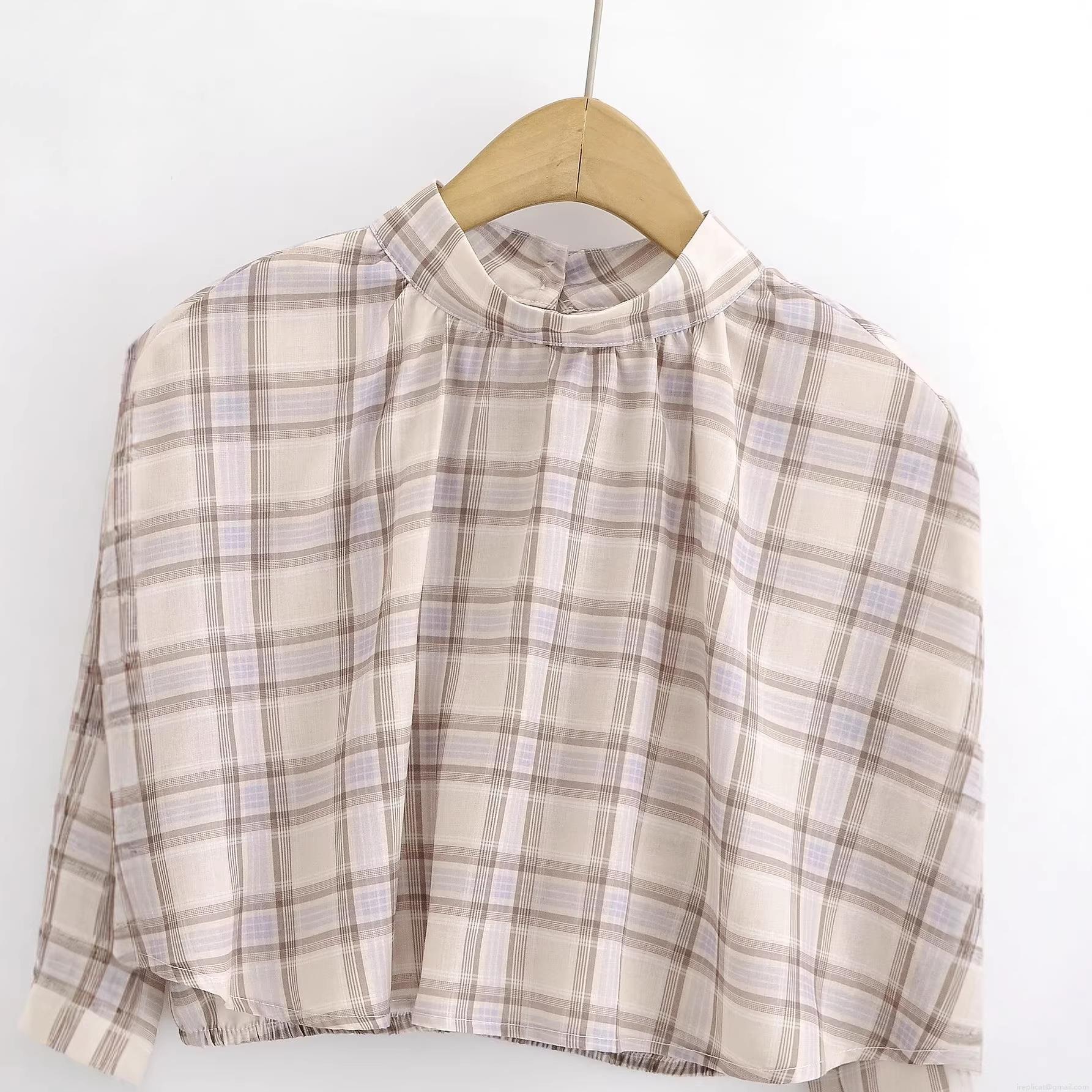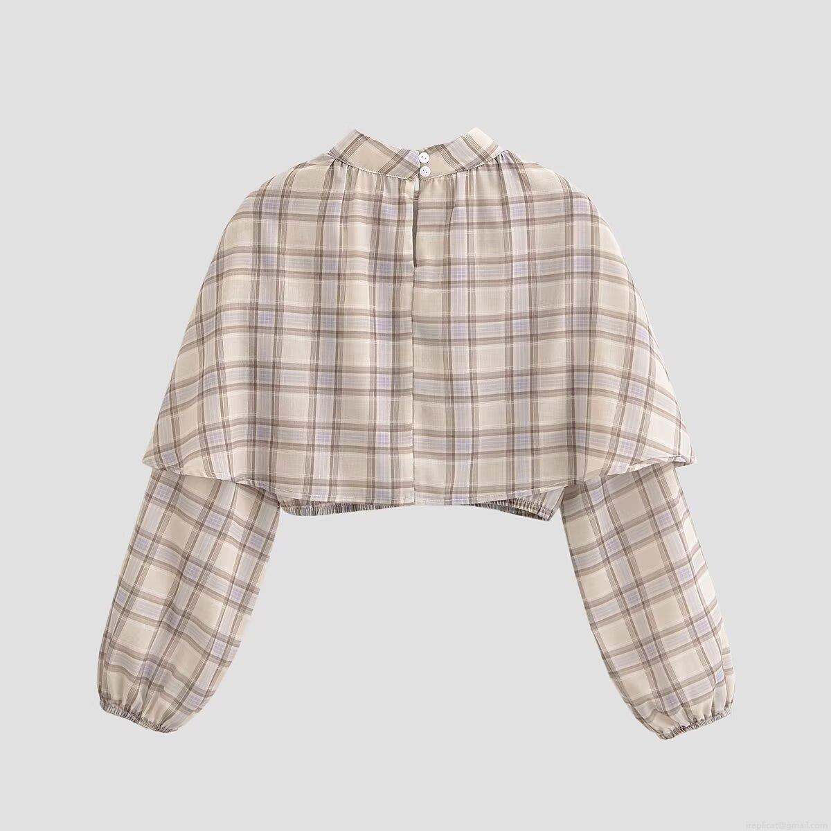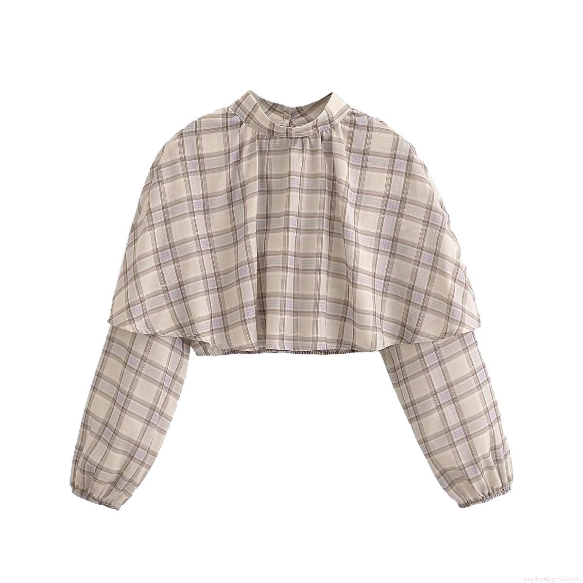 Women's Plaid Long Sleeve Blouse 100% Polyester Stand Collar Tiered Design Short Length Top Casual Streetwear Spring Summer Chic Checkered Shirt