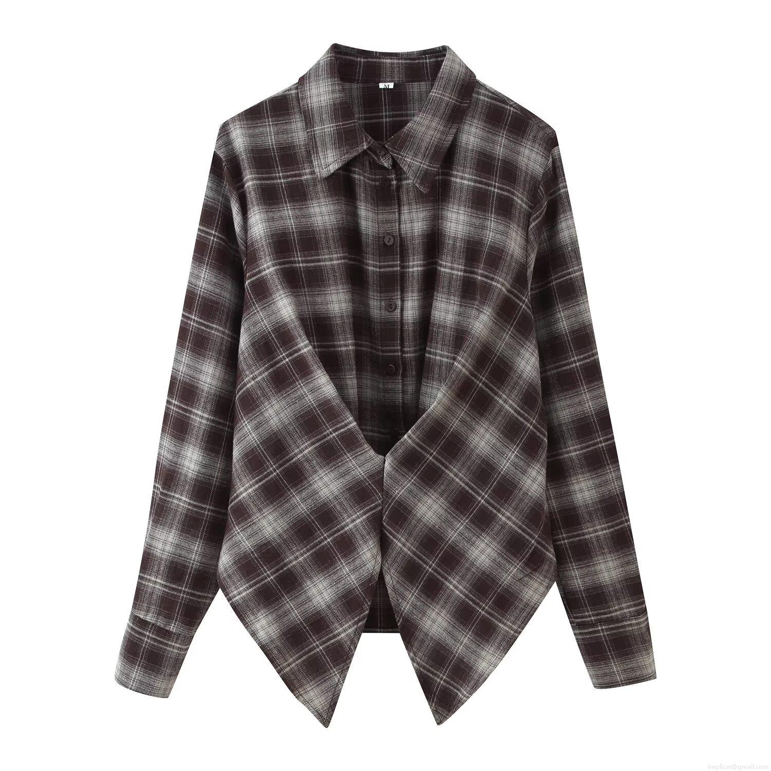 Women's Plaid Long Sleeve Shirt Irregular Waist Hem Lapel Polyester Blouse Casual Streetwear Elegant Tops For Women Spring Autumn