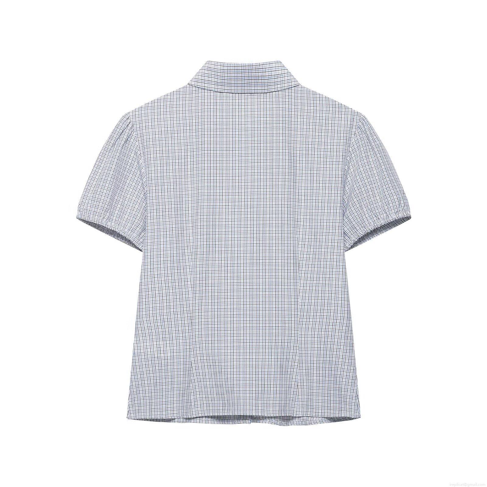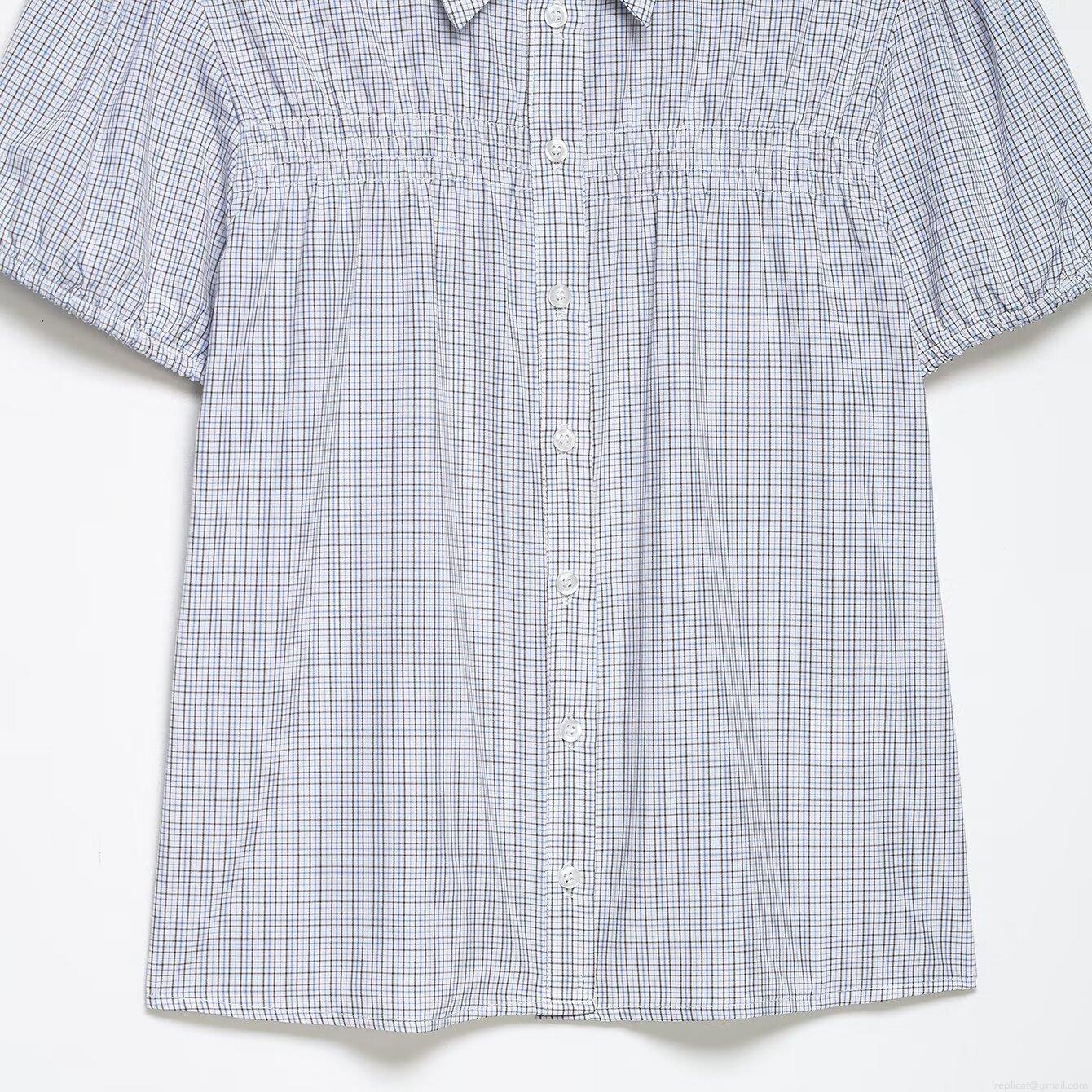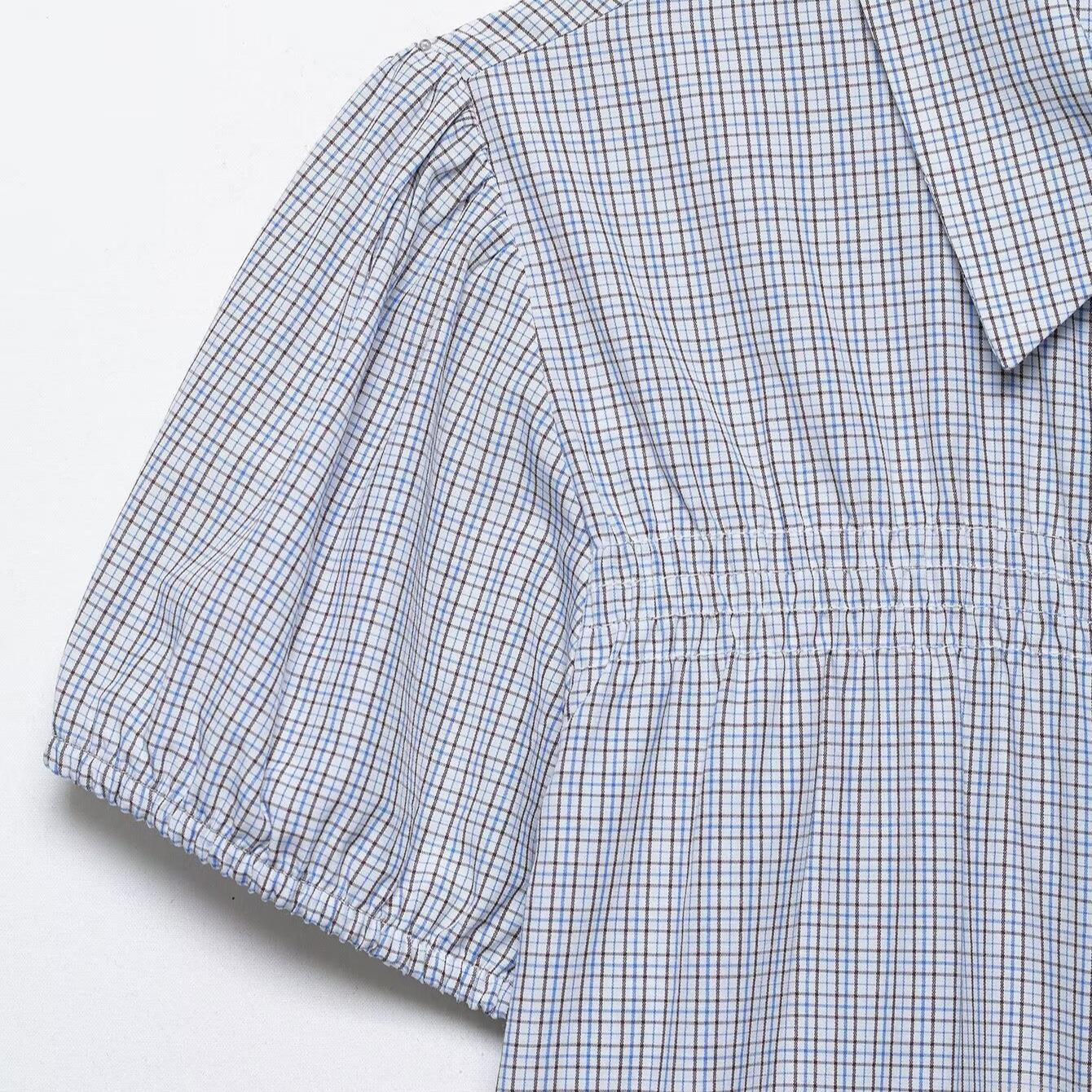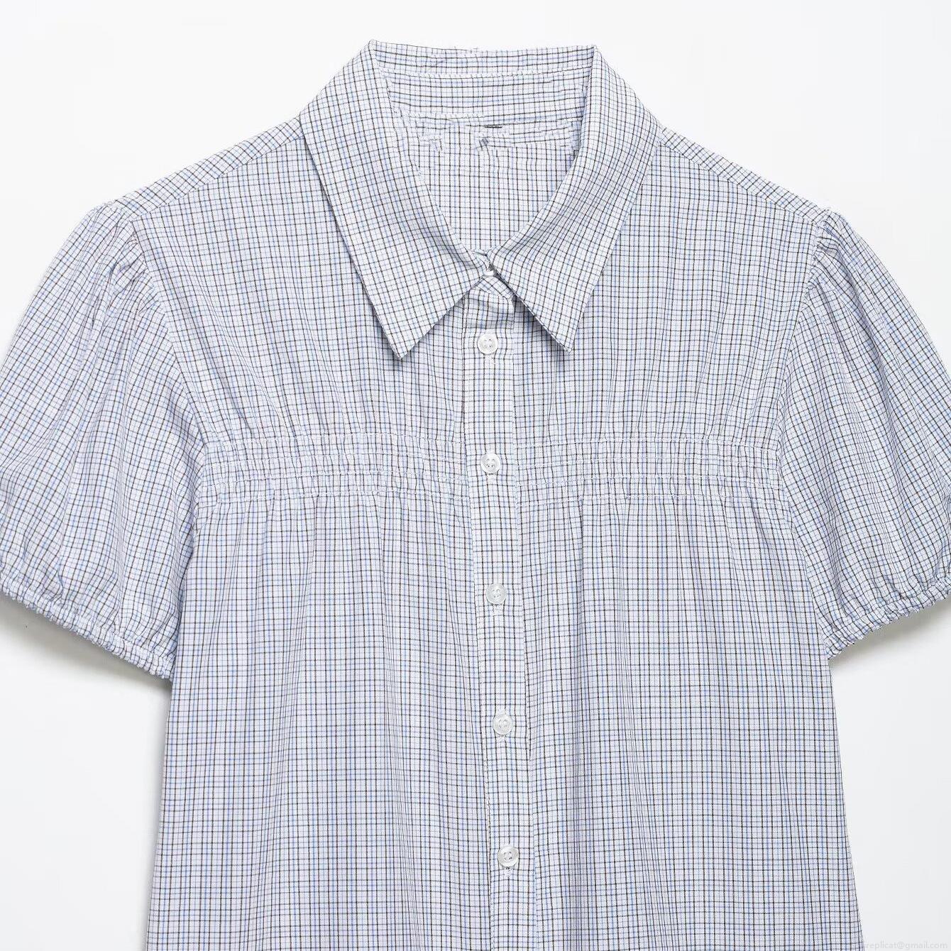 • Women's Plaid Puff Short Sleeve Blouse Gingham Ruched Smocked Top Button Down Lapel Collar Casual Commuter Shirt Polyester Spandex Blend Summer Clothing