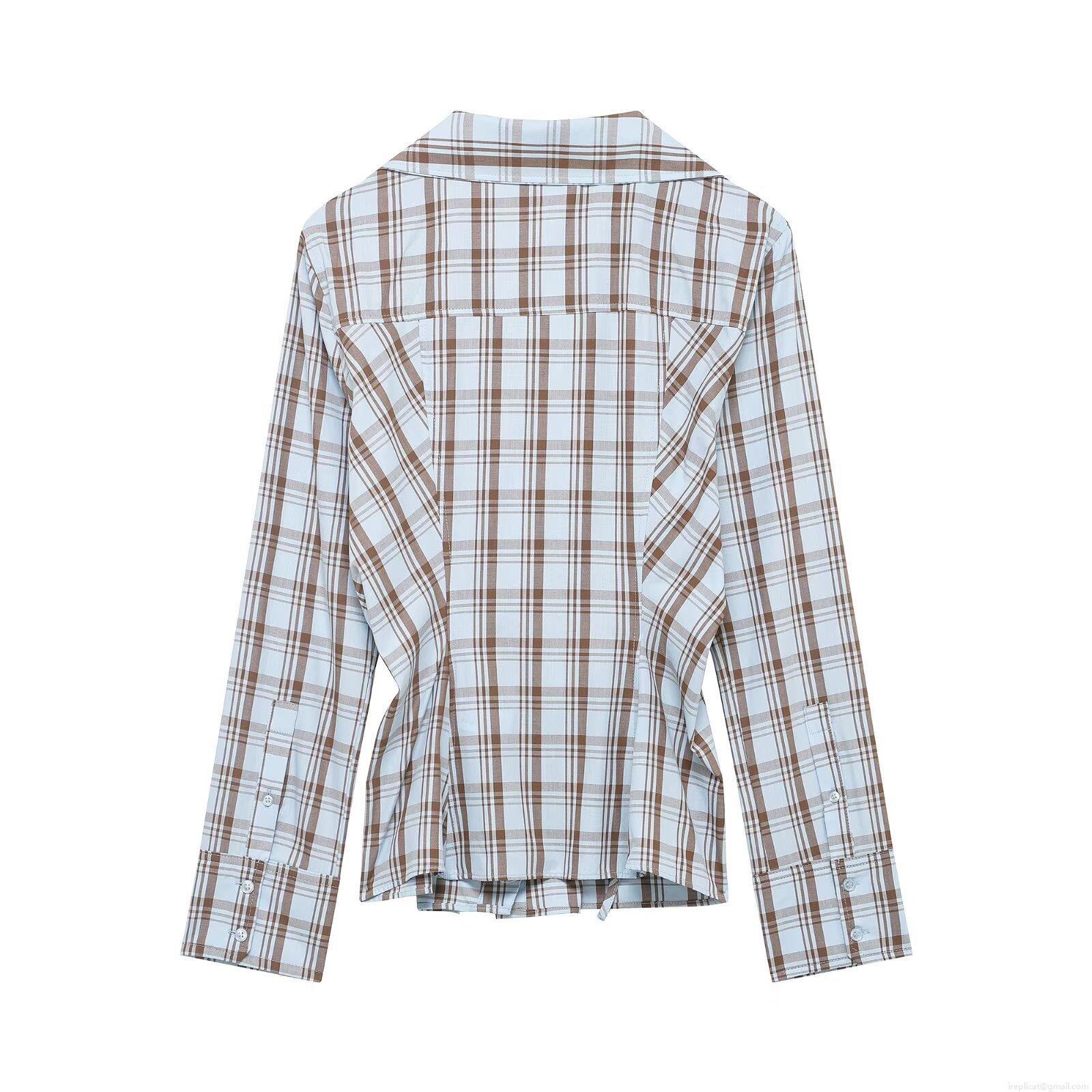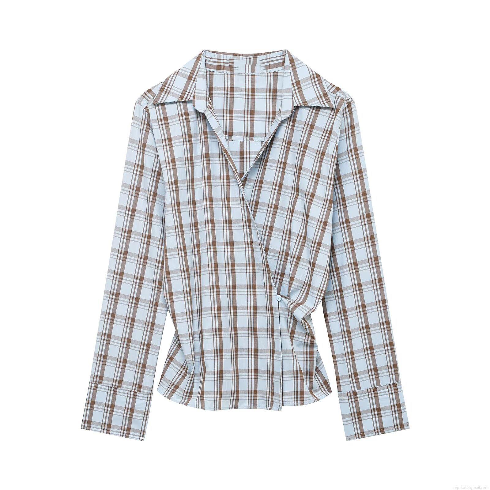 Women's Plaid Wrap Blouse Long Sleeve V-Neck Asymmetrical Button Waist Detail Polyester Spandex Blend Daily Casual Office Fashion Sweet Top For Women