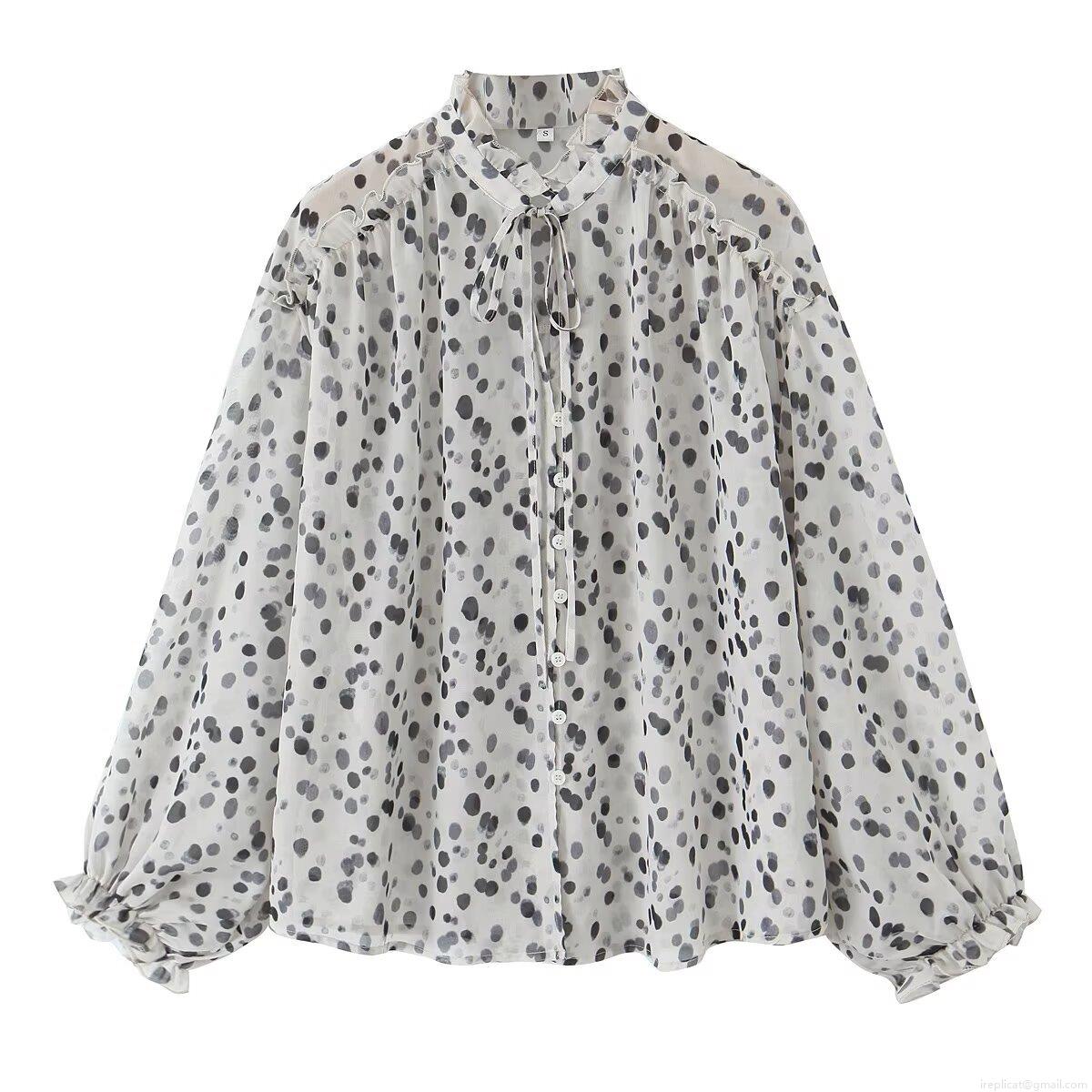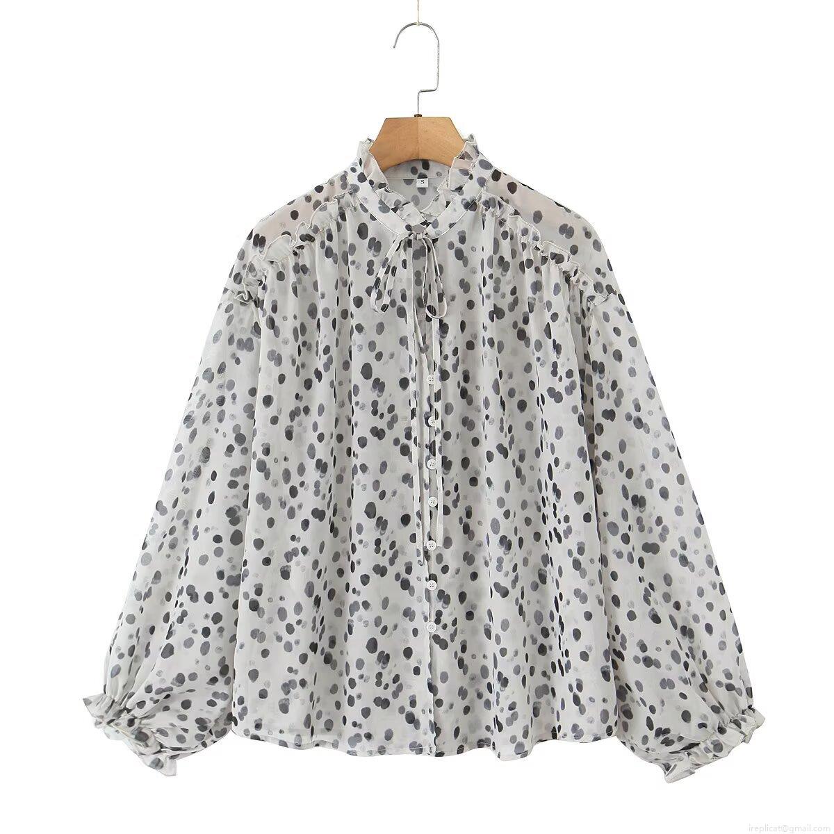 Women's Polka Dot Chiffon Blouse Elegant Wood Ear Ruffle Stand Collar Lantern Sleeve Shirt Loose Casual Streetwear Tie Bow Front Tops for Women