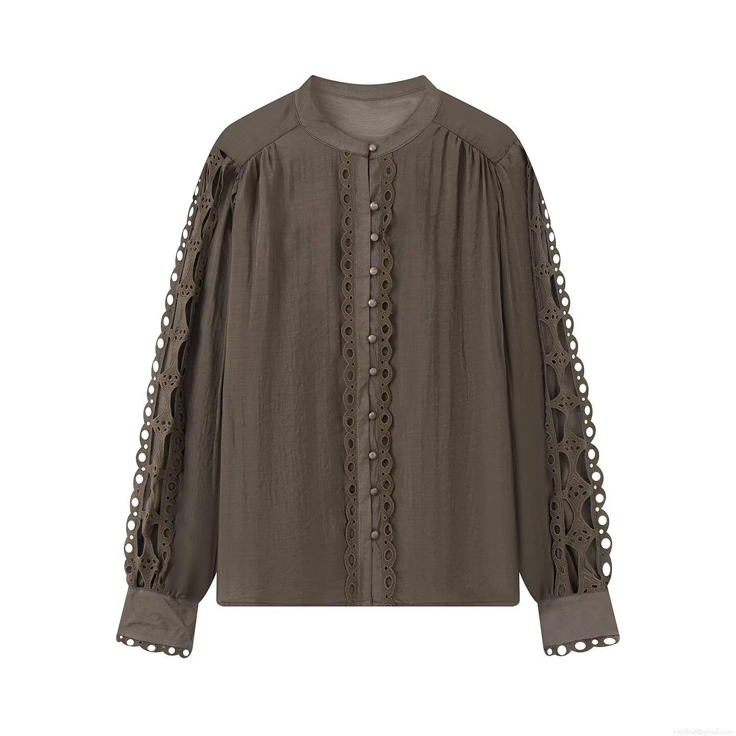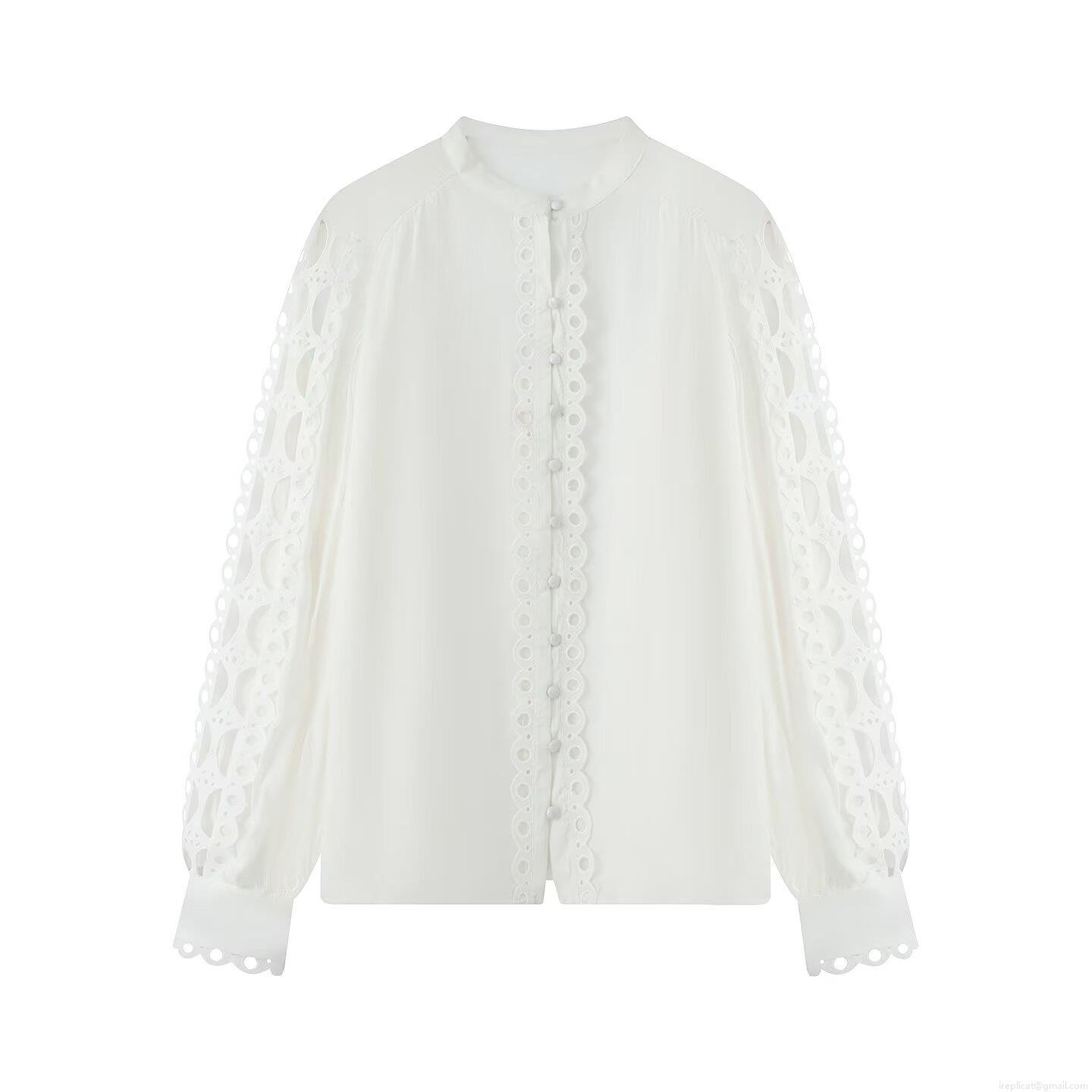 • Women's Polyester Elegant Hollow Out Lace Trim Patchwork Blouse Round Neck Long Sleeve Single Breasted Casual Shirt Top for Women Autumn Streetwear