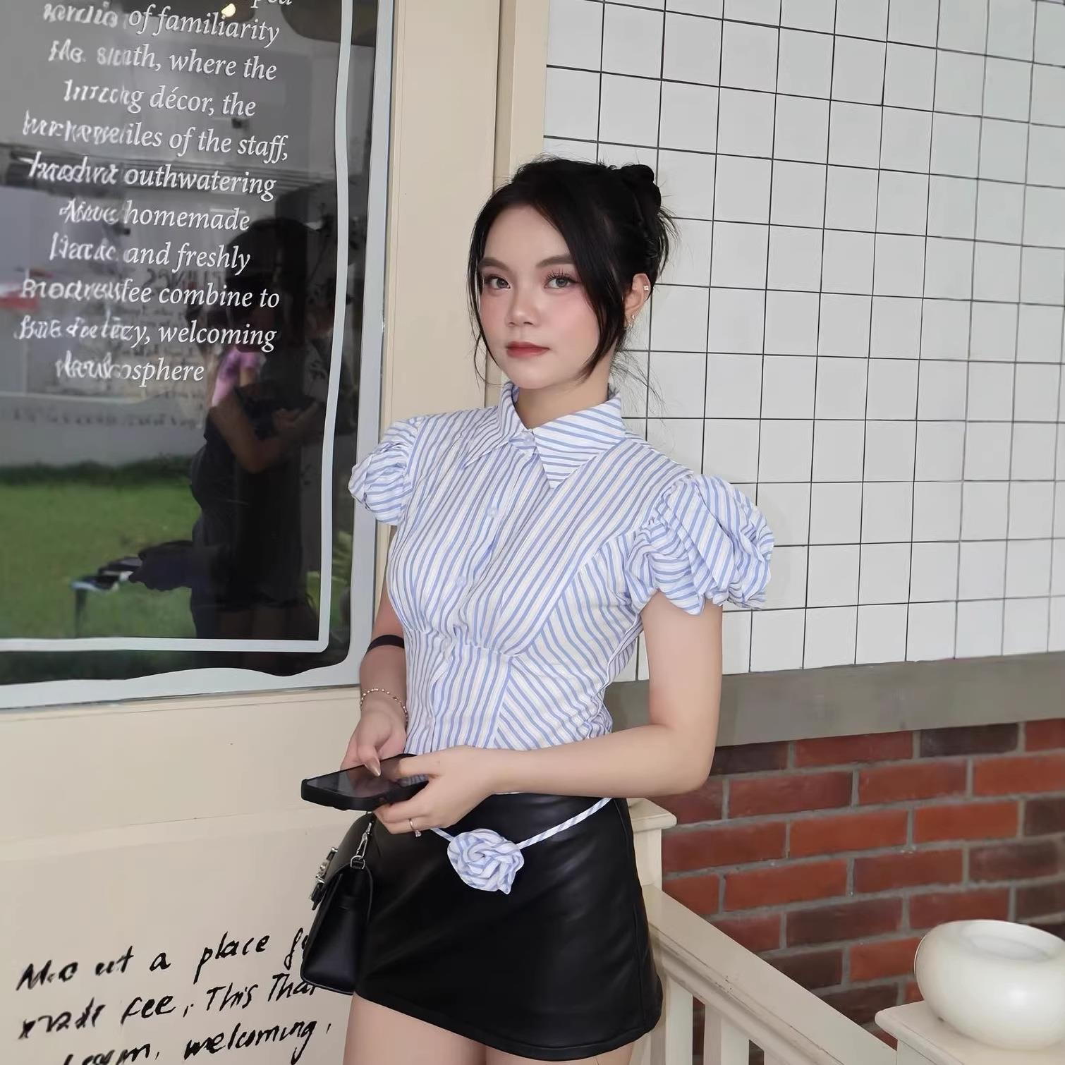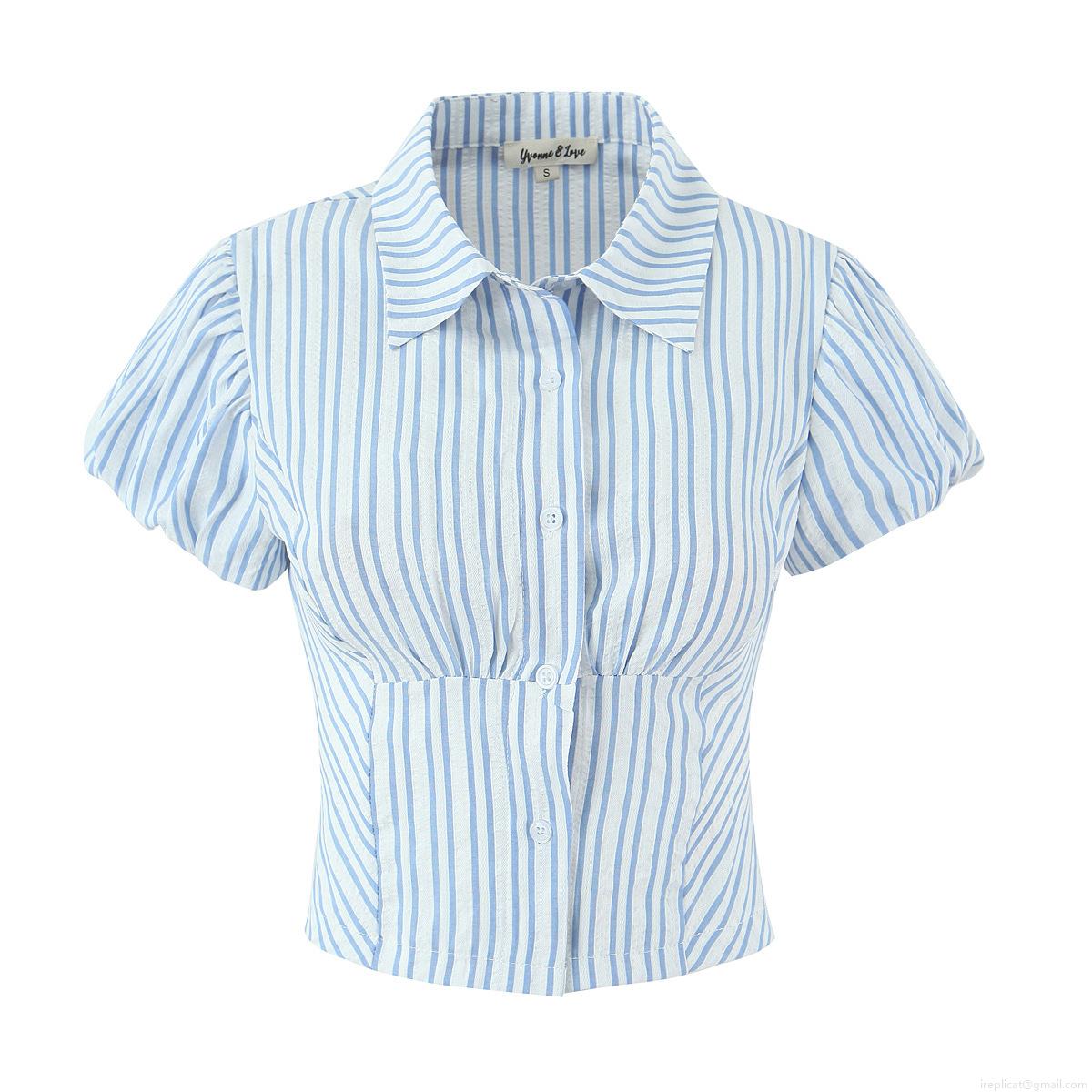 Solid Color, Stripe, 3d Decoration, Puff Sleeves, Jacquard Texture, Shirt Collar