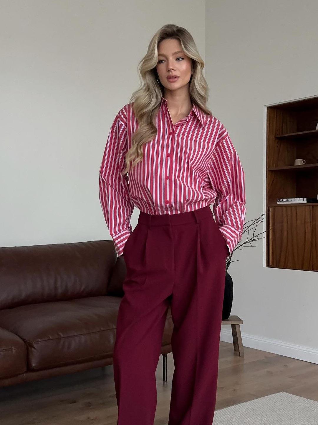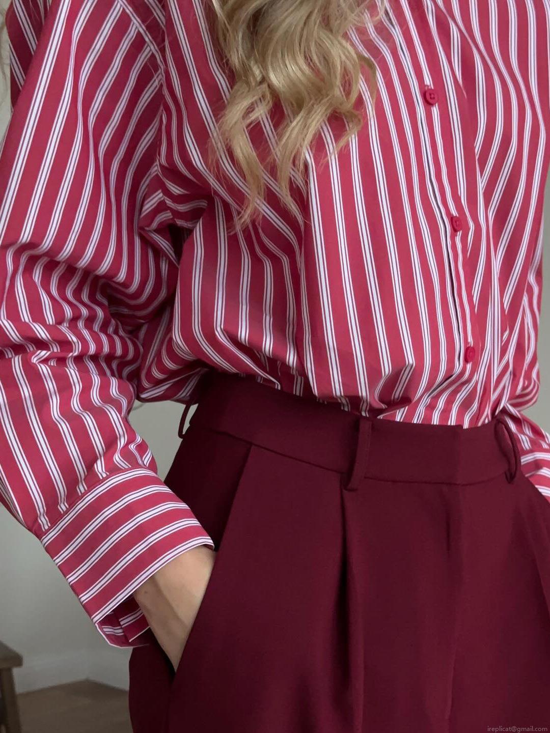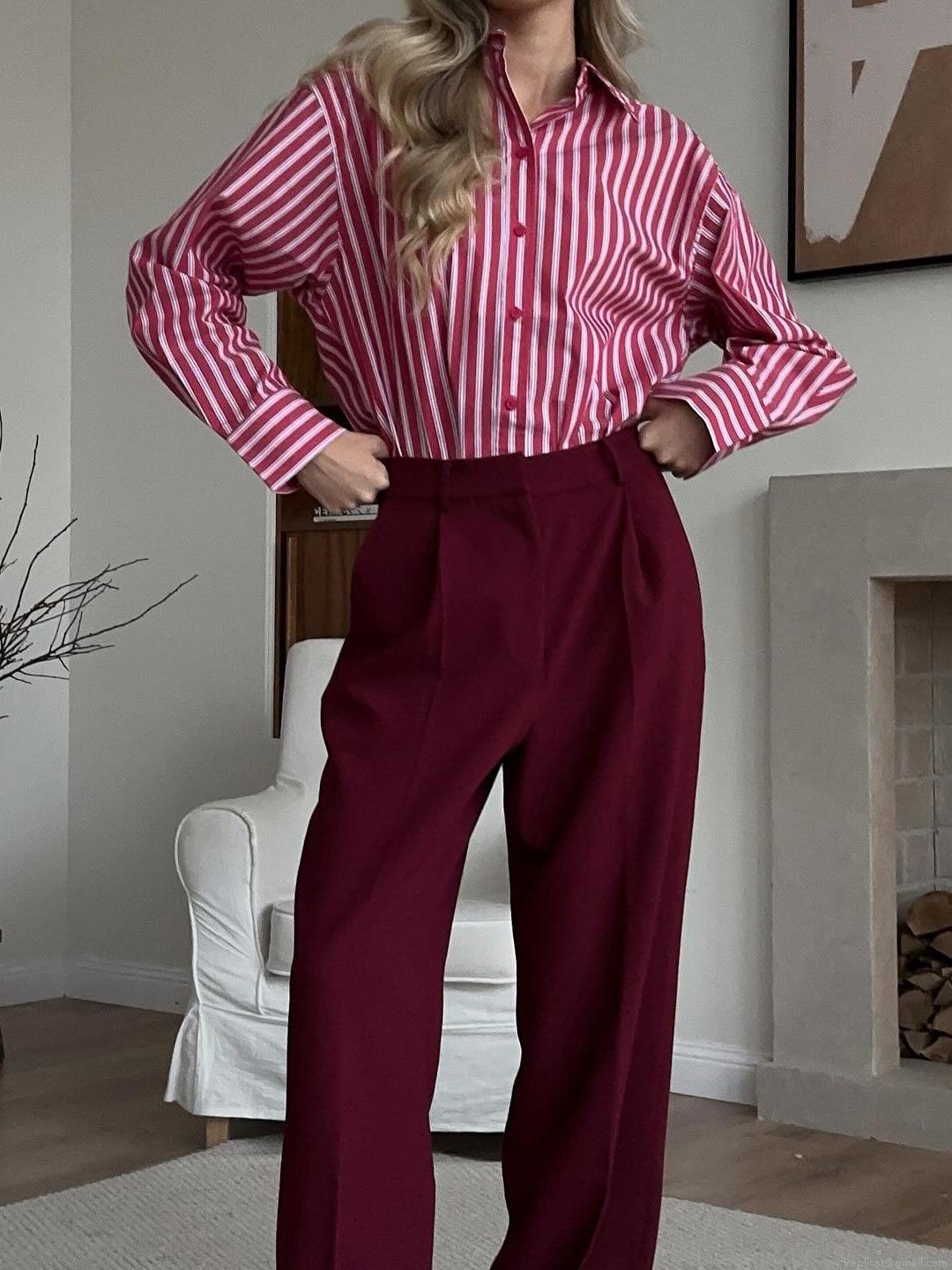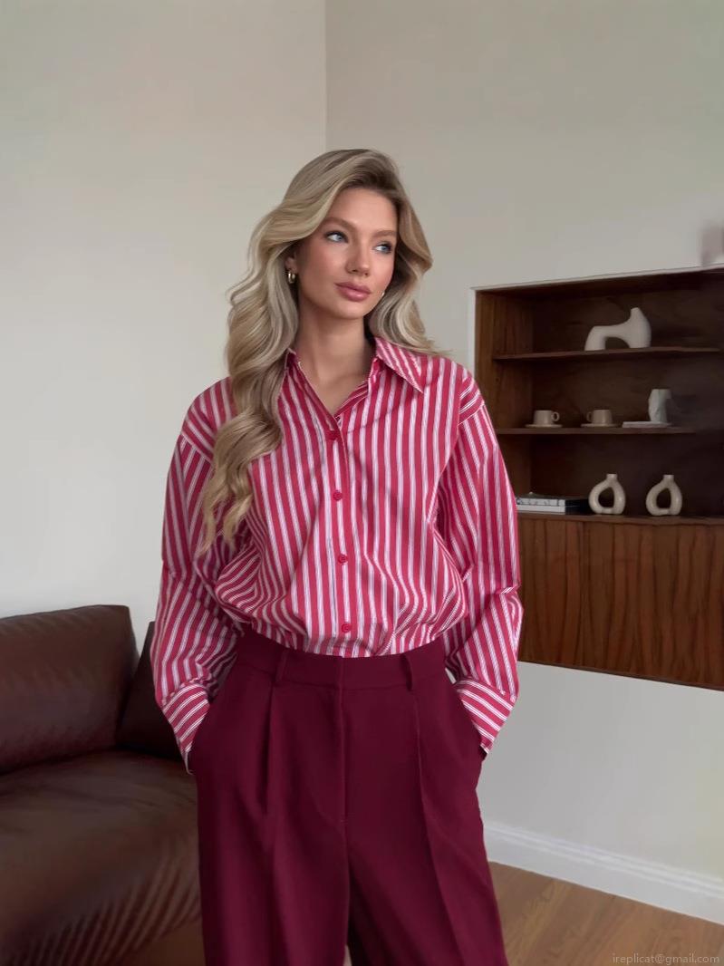 • Women's Red and White Striped Long Sleeve Button Down Blouse Cotton Blend Slim Fit Office Work Shirt Elegant Casual Top