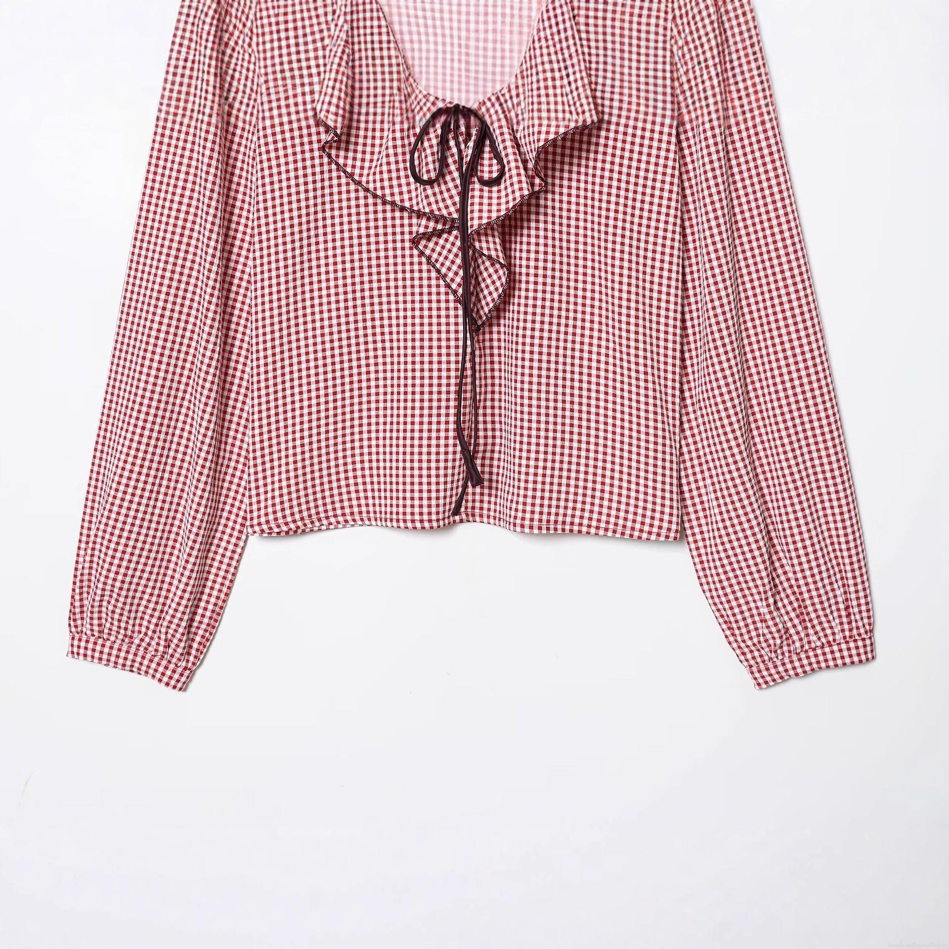 • Women's Red White Gingham Plaid Polyester Blouse With Ruffle V-Neck And Lace Up Detail Long Sleeve Loose Fit Casual Streetwear Fall Tops