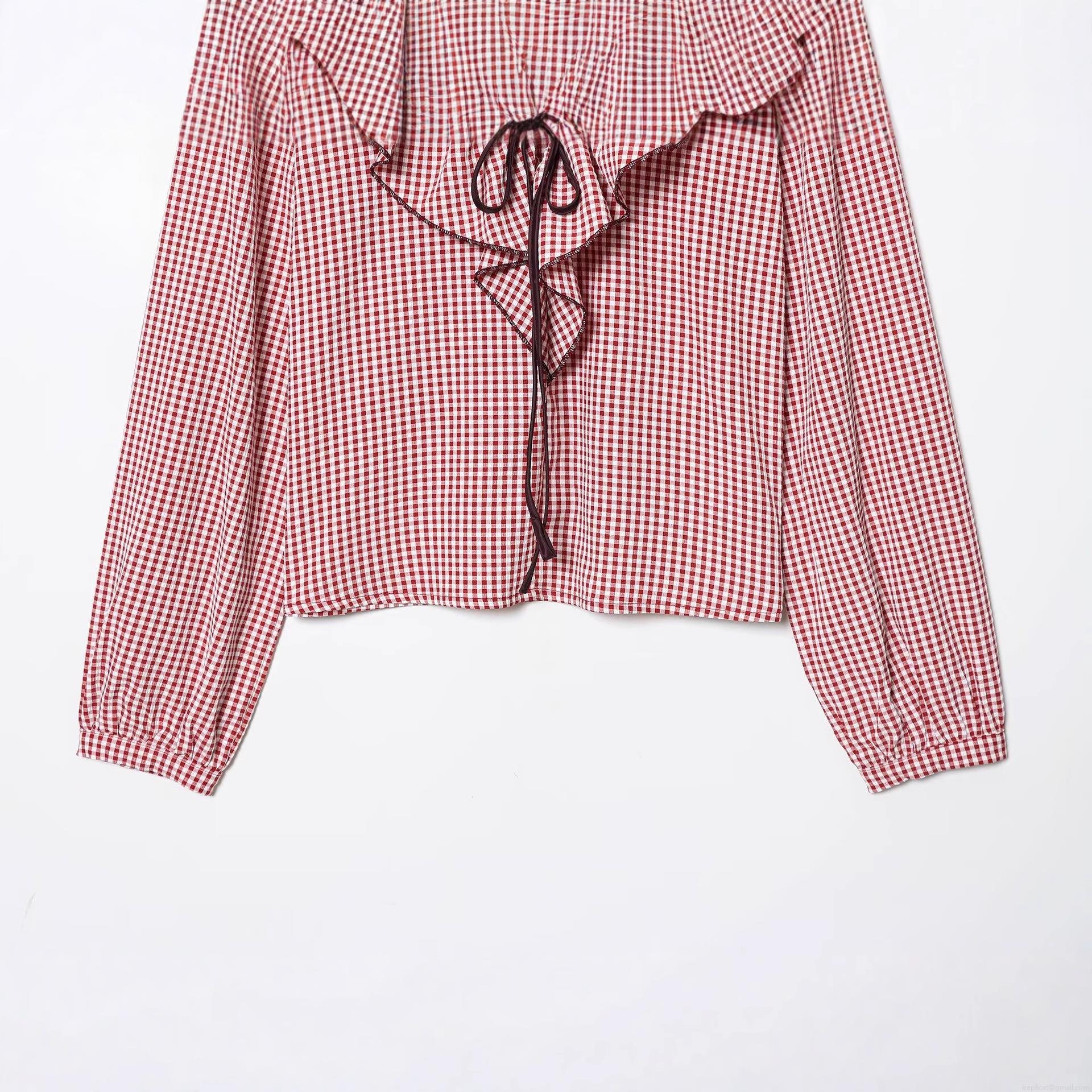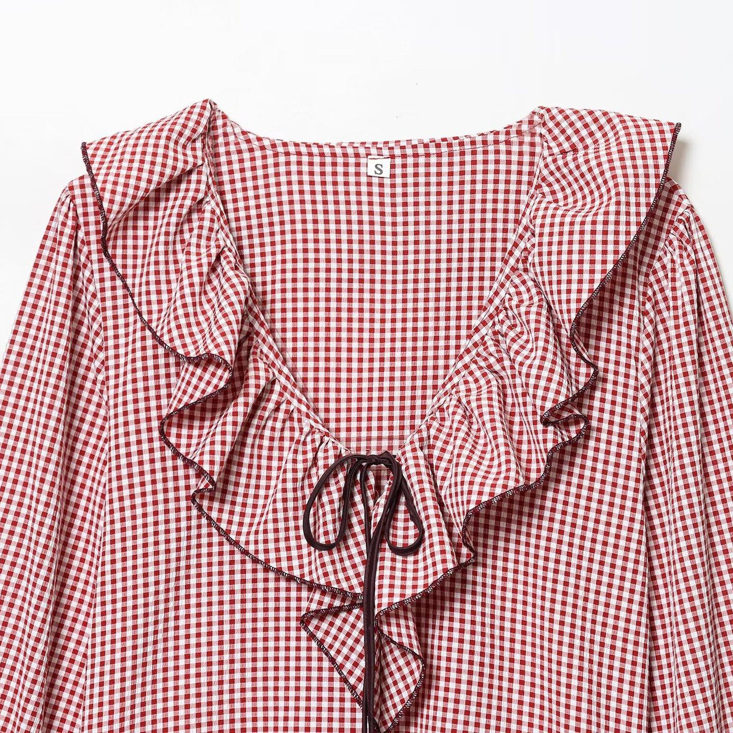 • Women's Red White Gingham Ruffle V-Neck Long Sleeve Blouse Vintage Checkered Tie-Front Shirt Top Polyester Casual Sweet Style Ladies Spring Autumn Wear