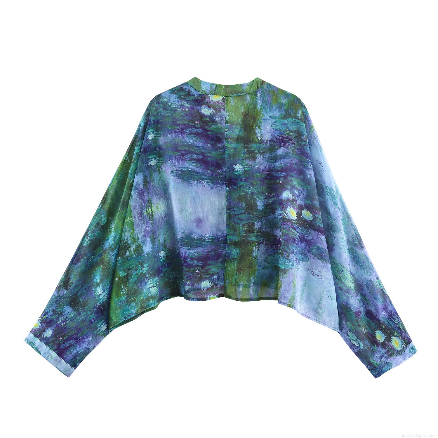 Women's Retro Artistic Chiffon Blouse Featuring Monet Water Lily Oil Painting Print V-Neck Batwing Sleeve Loose Fit Casual Button Down Top