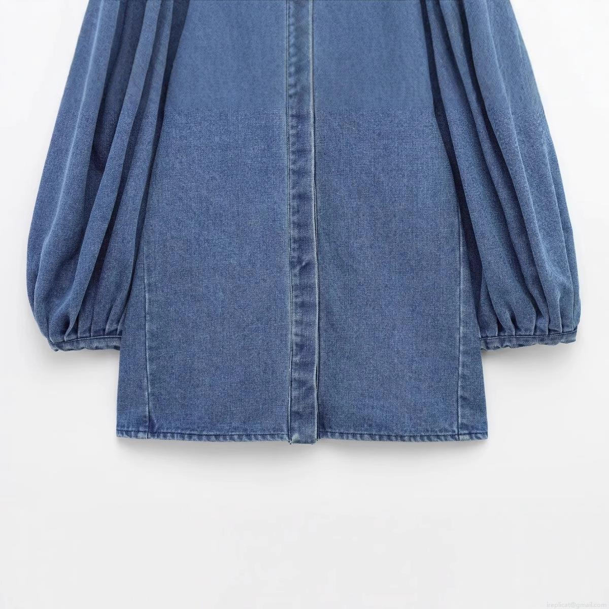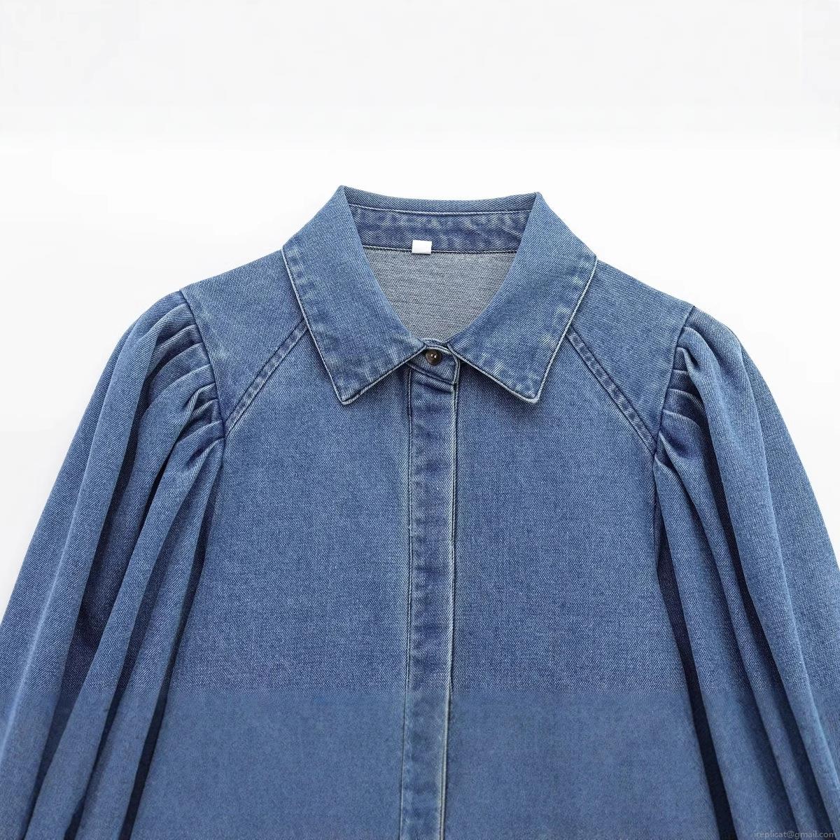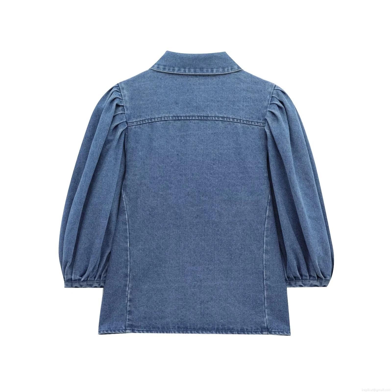 • Women's Retro Blue Denim Blouse Puff Lantern Long Sleeve Lapel Button Up Shirt Casual Pure Cotton Denim Top for Women