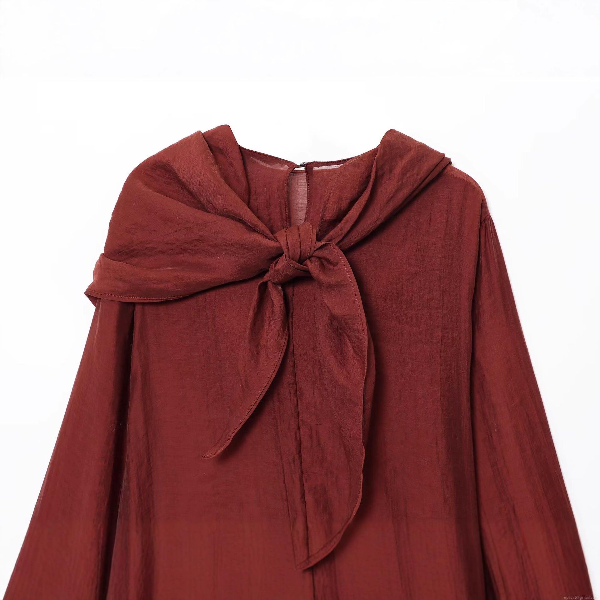 • Women's Retro Bow Tie Neck Blouse Elegant Long Sleeve Polyester Shirt Solid Color Crinkle Texture Casual Top for Office Dating