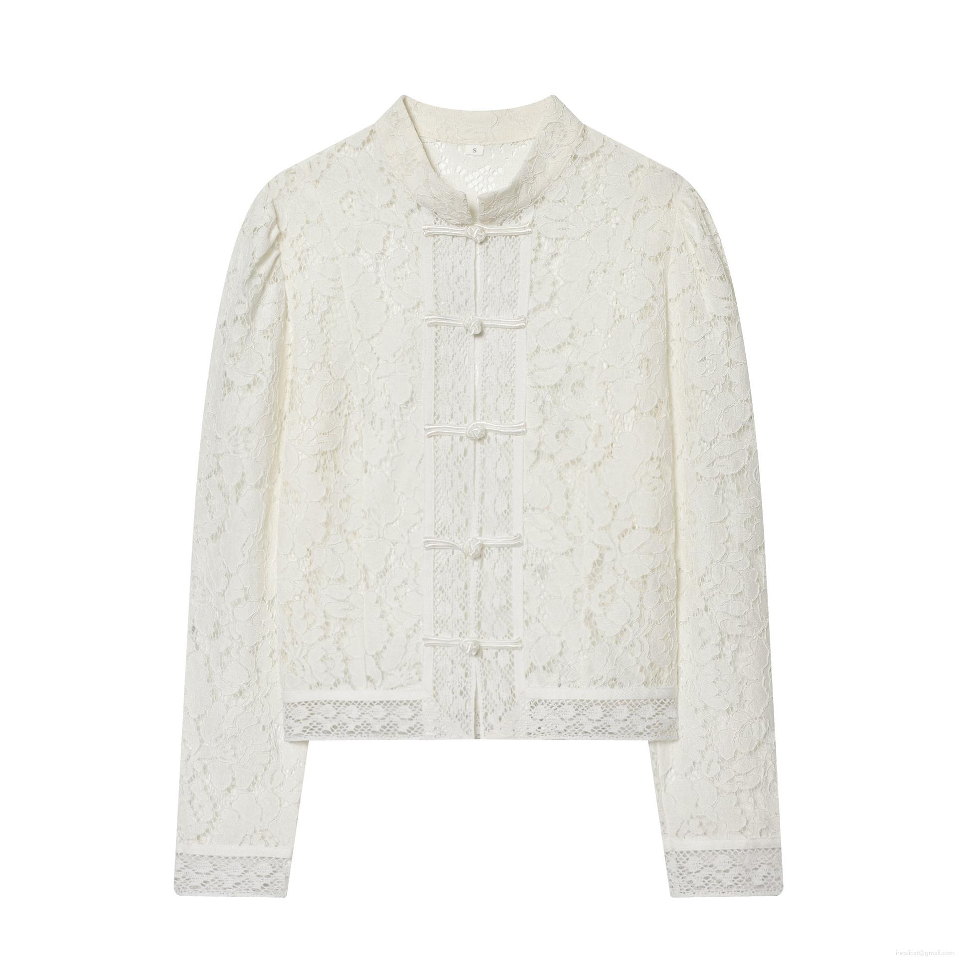 • Women's Retro Lace Crochet Blouse With Chinese Buttons Elegant Stand Collar Long Sleeve Party Shirt Top White Black