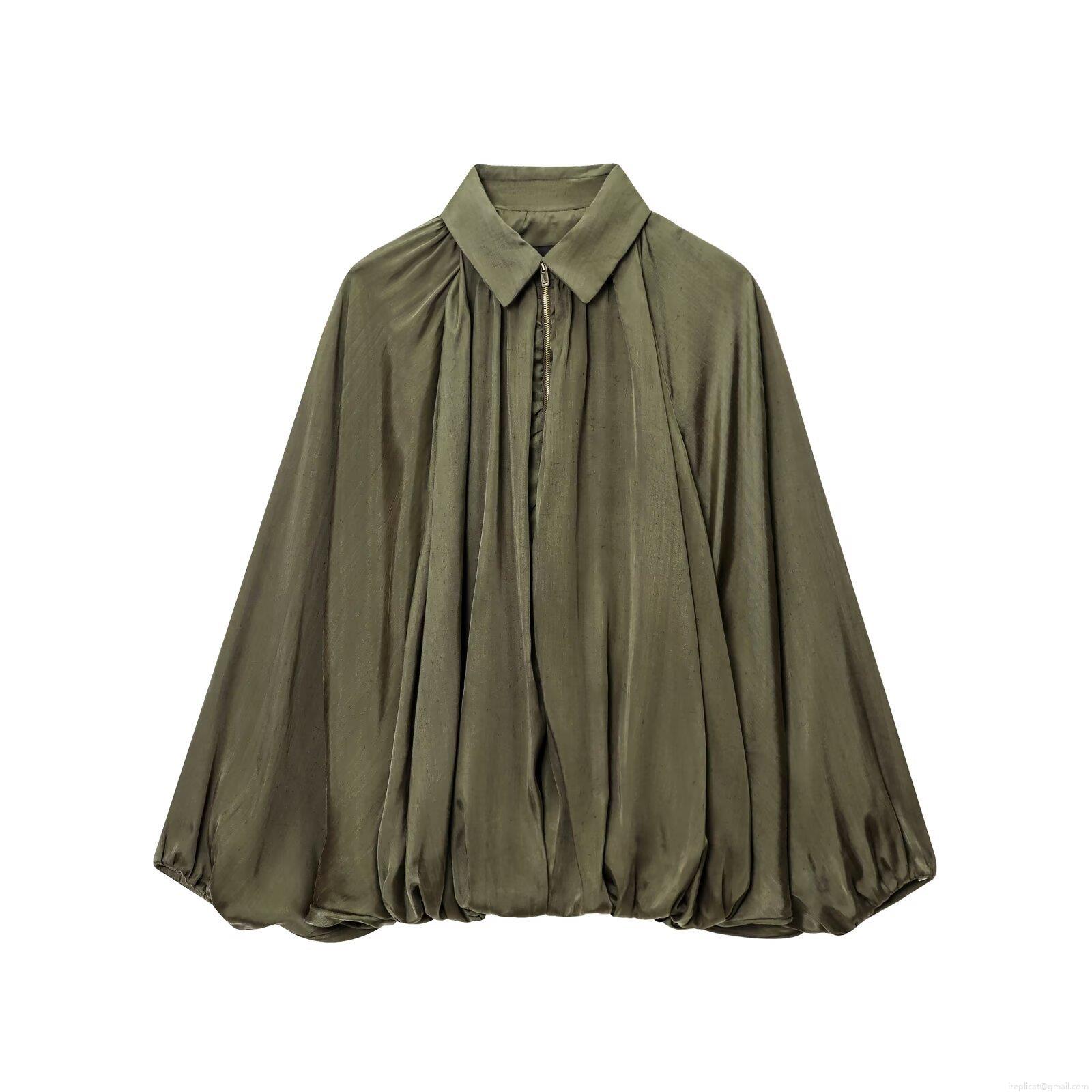 • Women's Retro Lantern Sleeve Blouse Oversized Pleated Polyester Zipper Front Shirt Solid Color Casual Loose Stand Collar Top