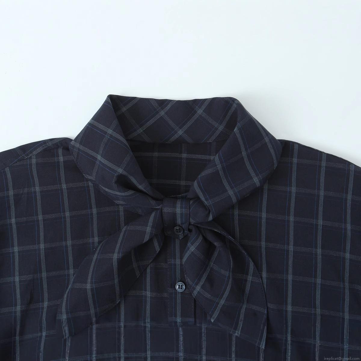 • Women's Retro Plaid Poplin Blouse Long Sleeve Button Down Shirt With Bow Tie Neck Elegant Office Lady Commuter Tops Navy Blue