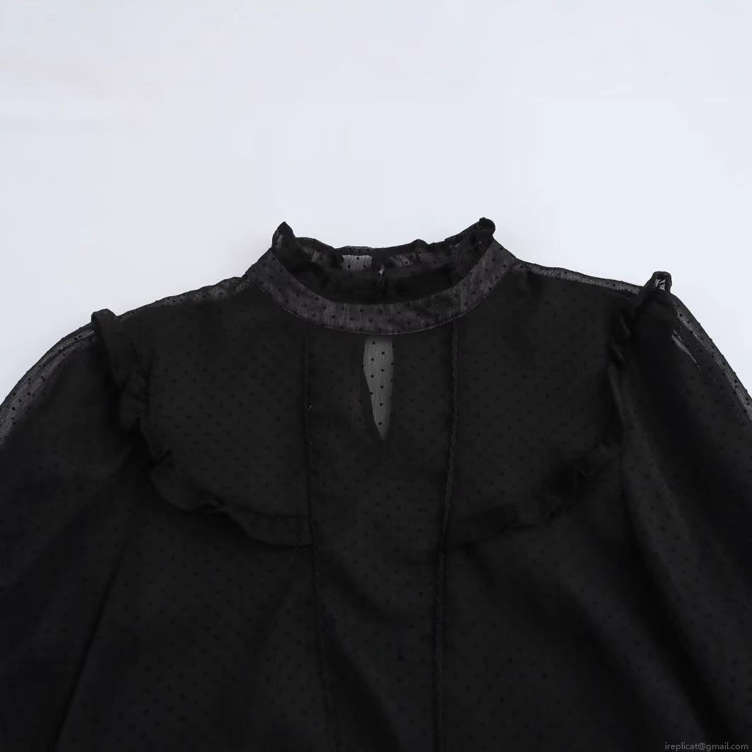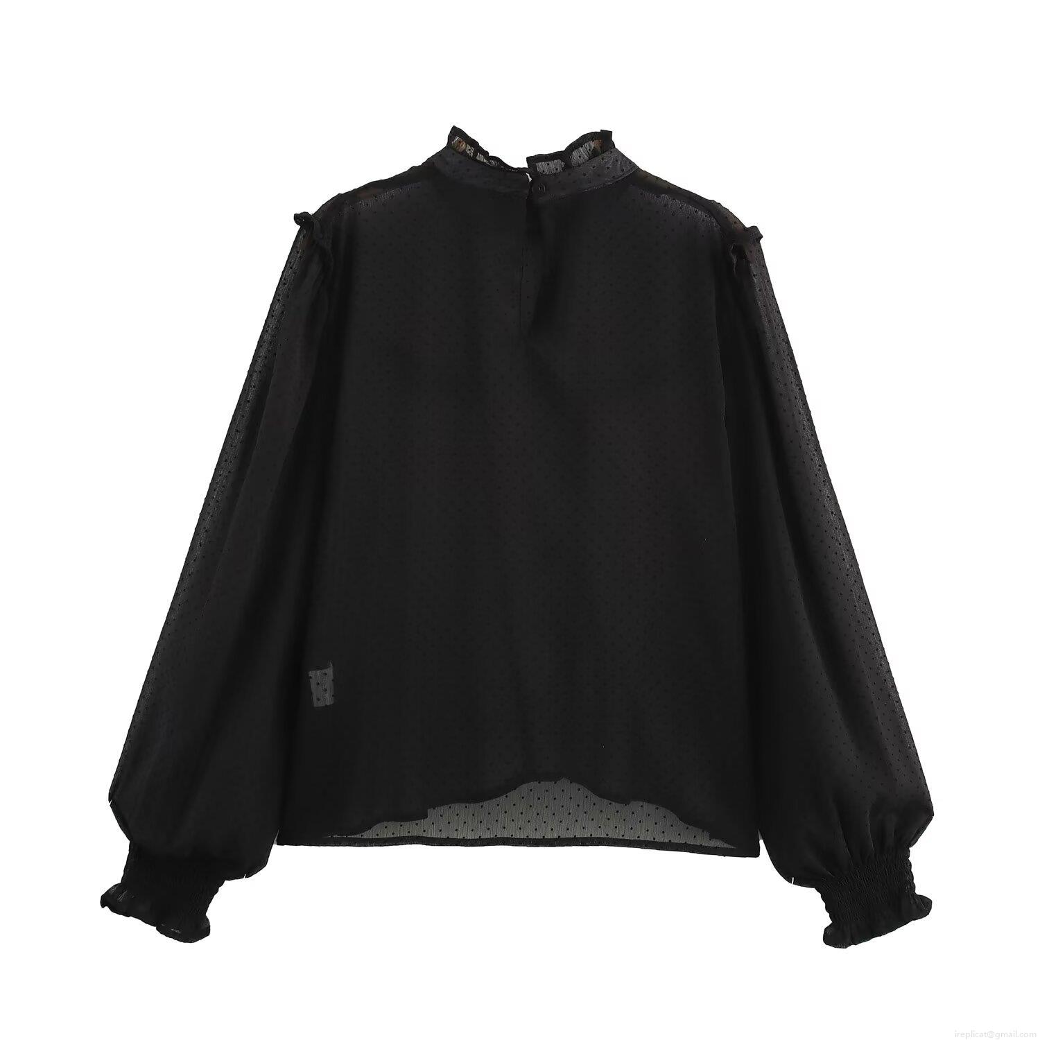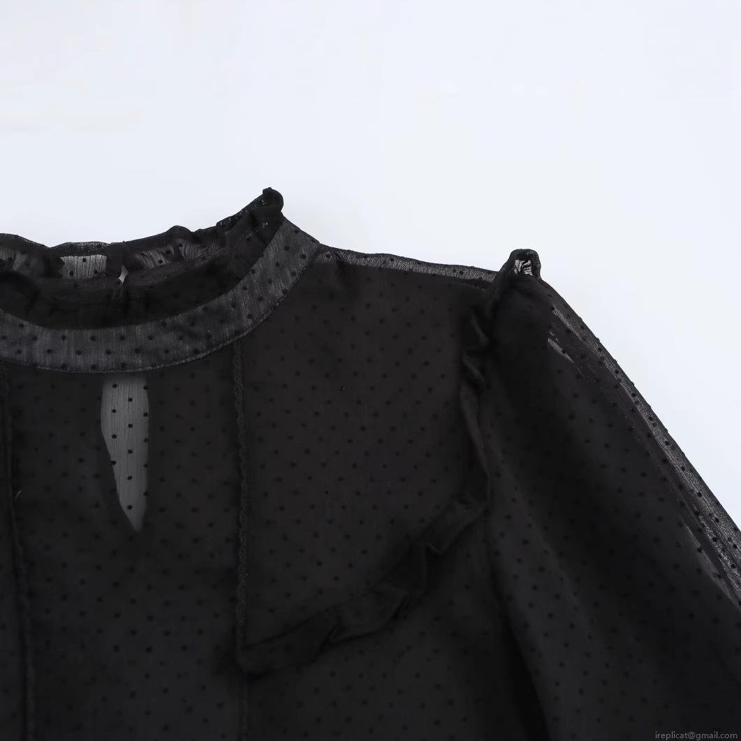 • Women's Romantic Black Chiffon Swiss Dot Blouse Ruffle Stand Collar Sheer Mesh Long Sleeve Shirt Top For Elegant Party Streetwear
