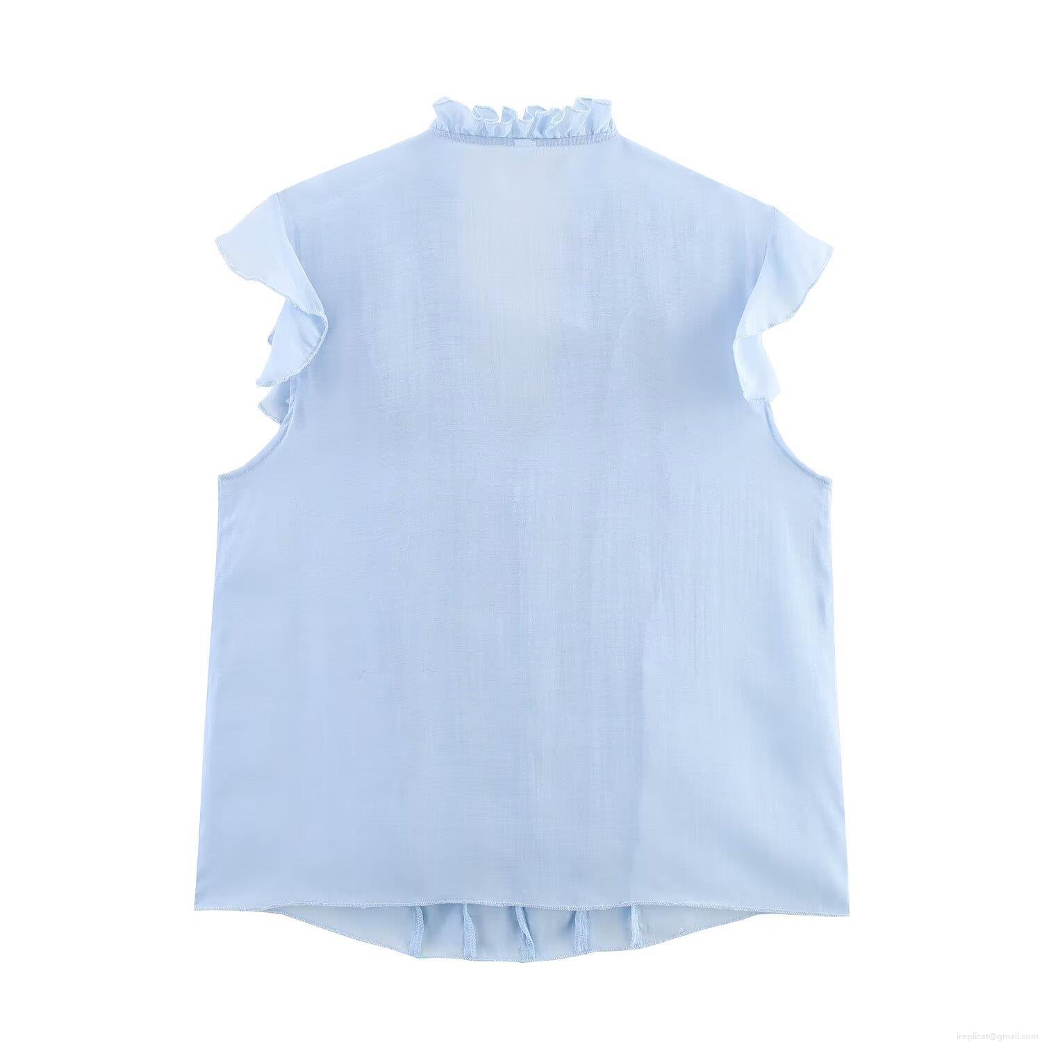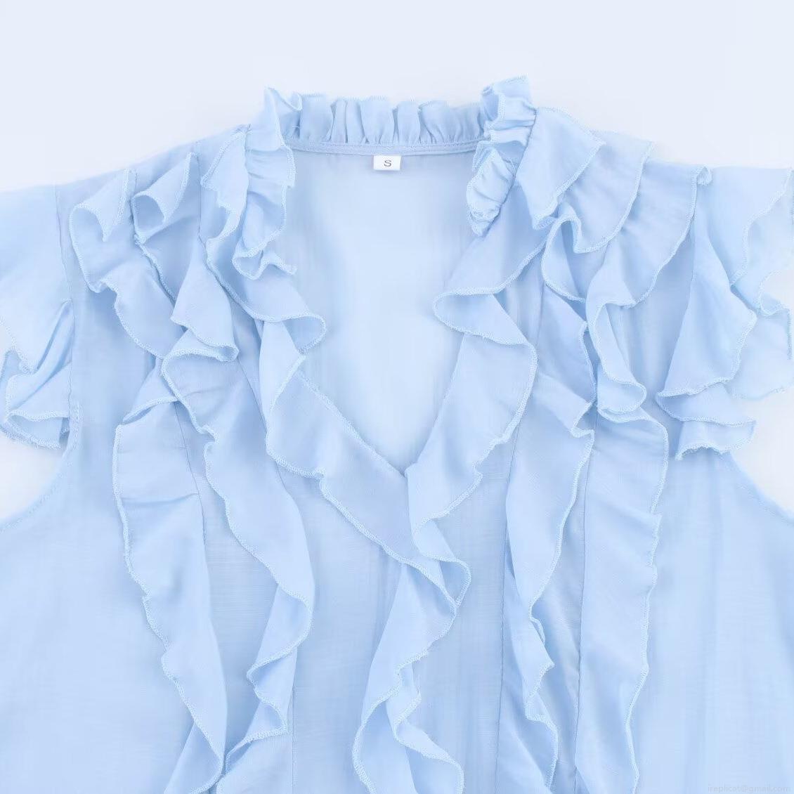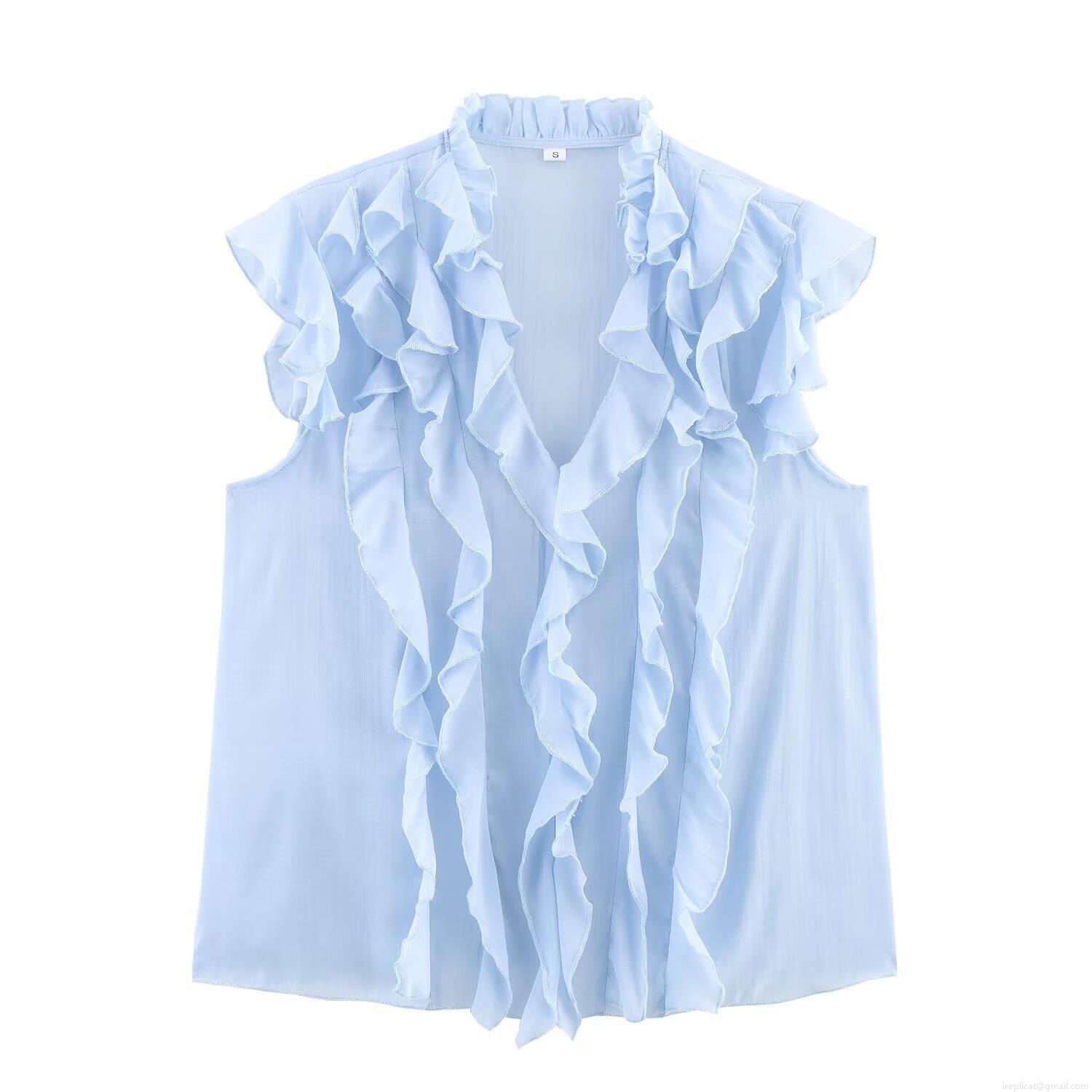 • Women's Romantic Ruffle V-Neck Sleeveless Blouse Light Blue 100% Polyester Lightweight Summer Tank Top Fashion Casual Shirt For Women