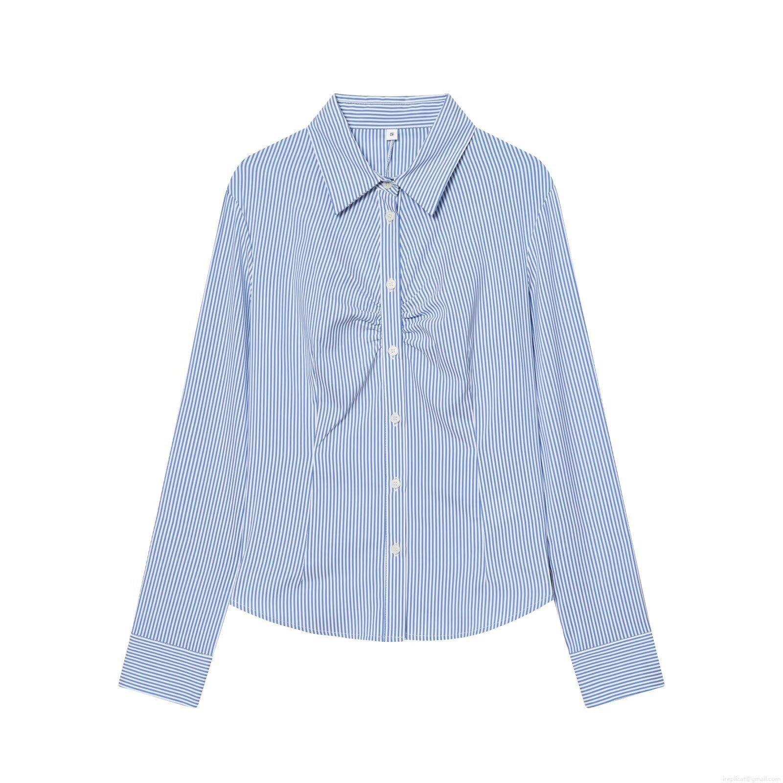 • Women's Ruched Long Sleeve Shirt Slim Fit Waist-Cinching Cotton Blend Striped Solid Blouse Lapel Neck Office Lady Casual Autumn Tops