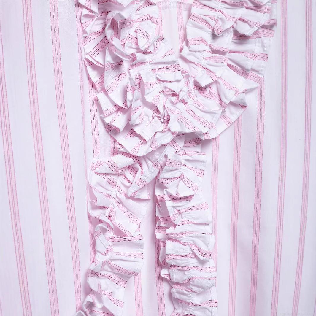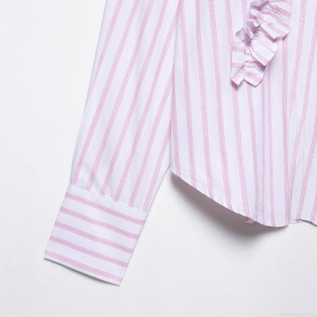 • Women's Ruffle Trim Striped Blouse V Neck Long Sleeve Polyester Shirt For Daily Casual Streetwear Fashionable 2025 Spring Tops