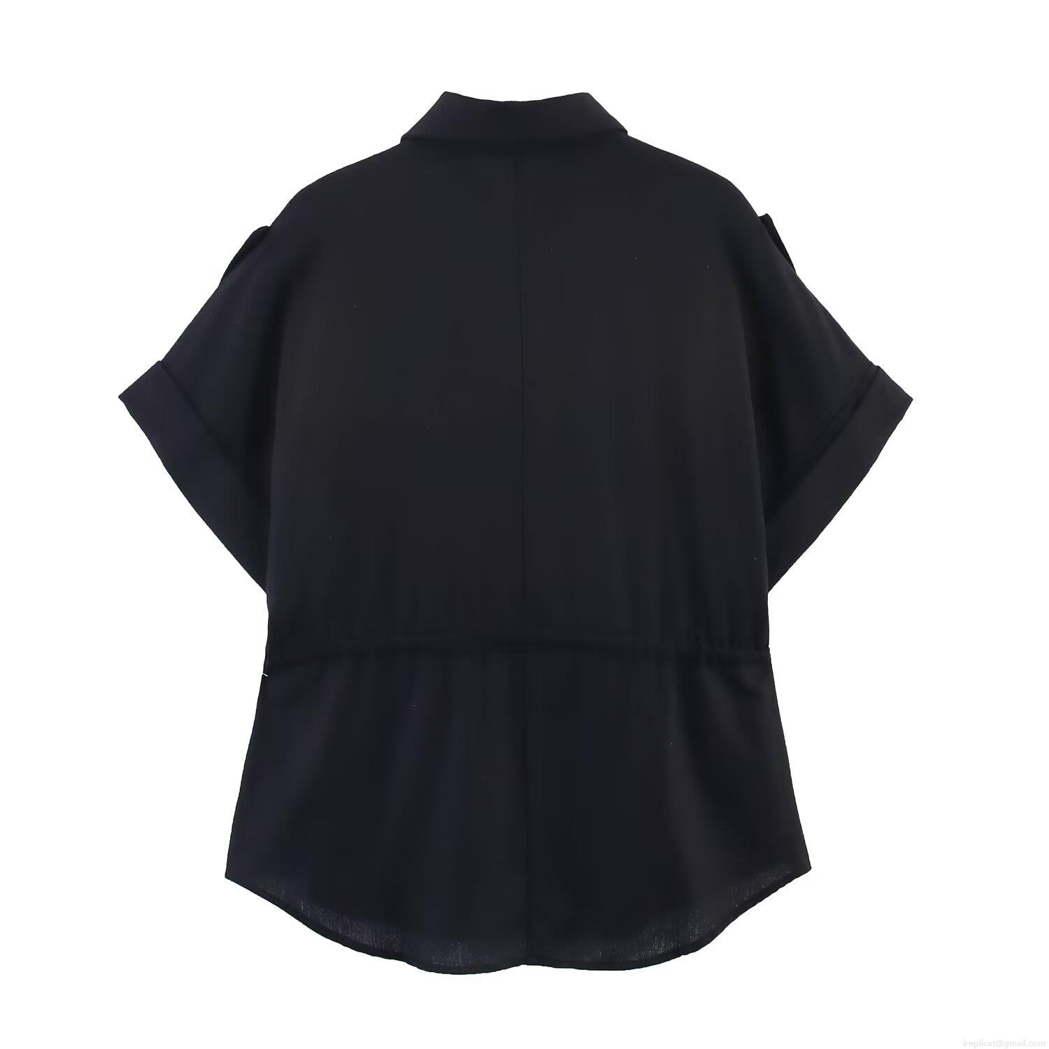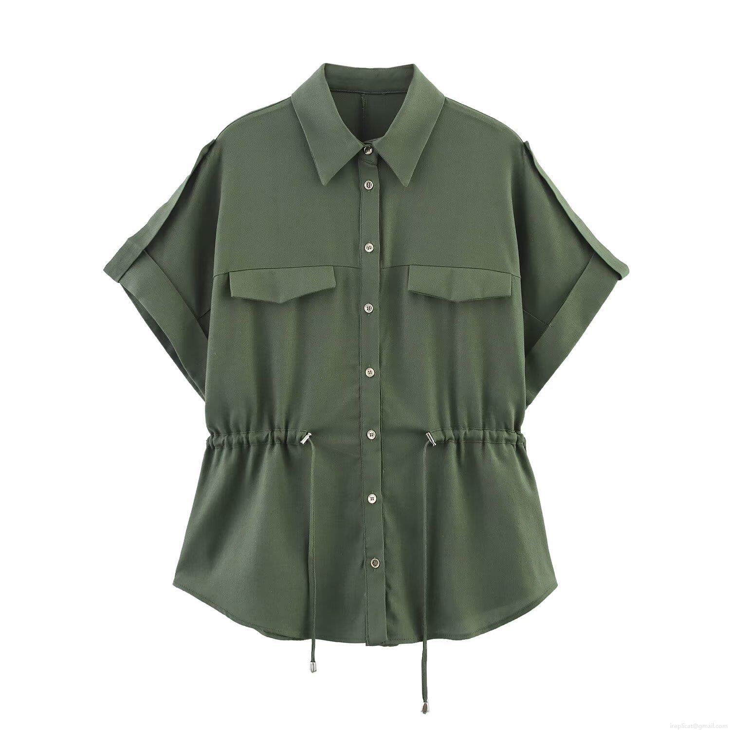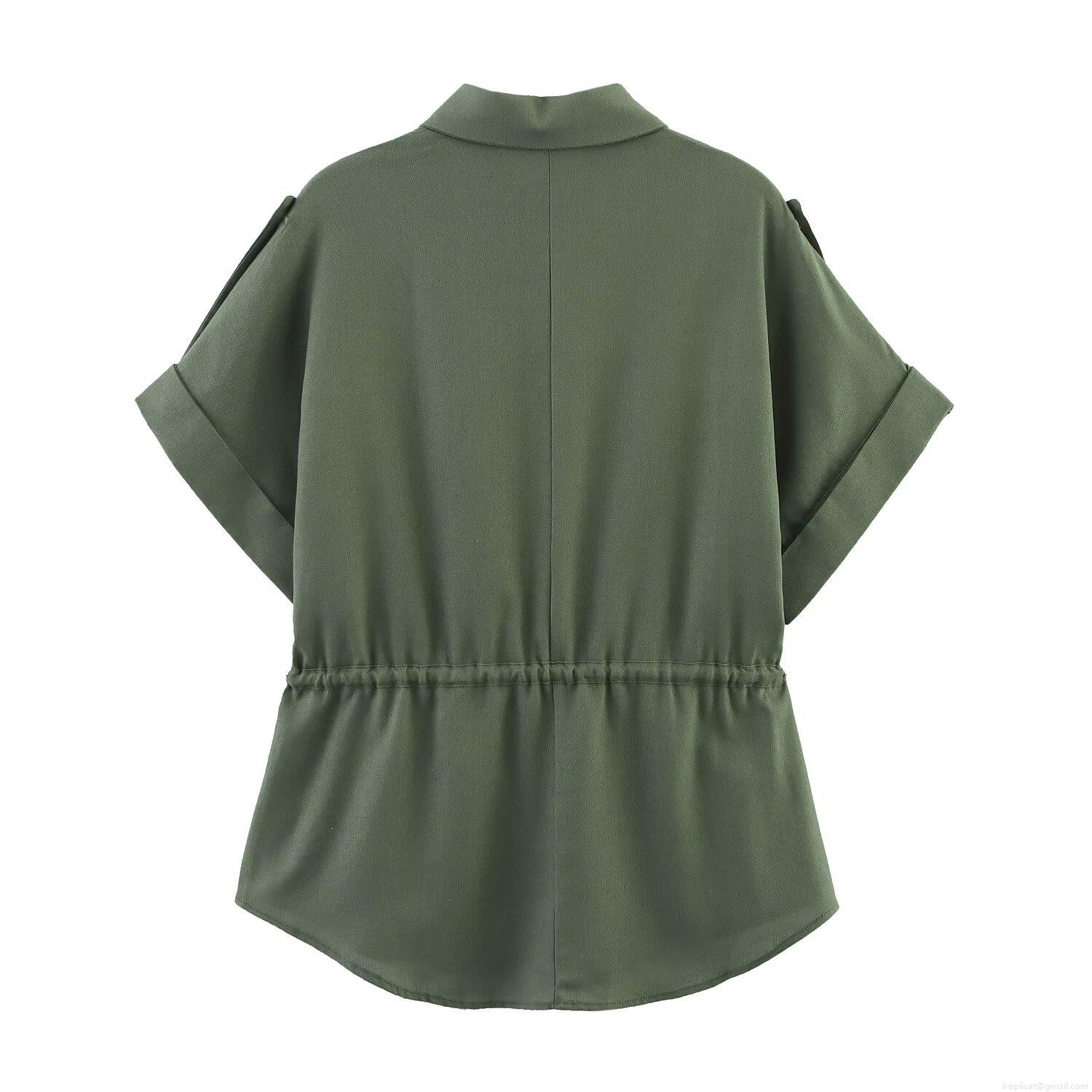 • Women's Safari Style Linen Blend Shirt Short Sleeve Button Down Waist Drawstring Utility Tops With Flap Pockets Women Summer Casual Office Lady Blouses
