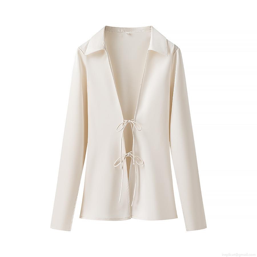 Women's Satin Long Sleeve Tie Front Blouse V Neck Solid Color Elegant Minimalist Streetwear Shirt Top For Ladies Spring Autumn Fashion