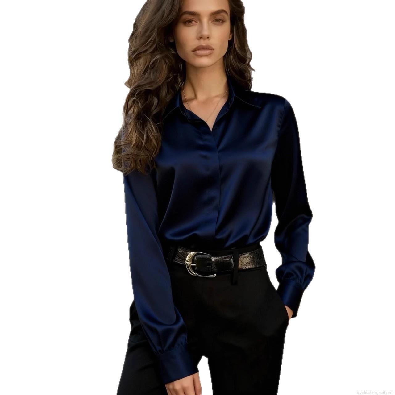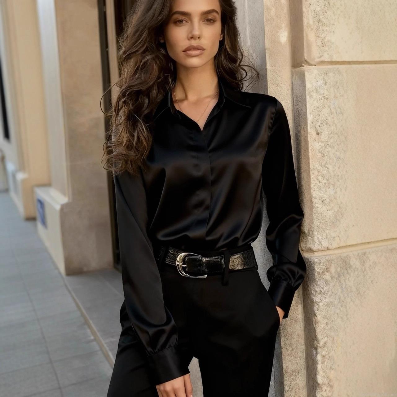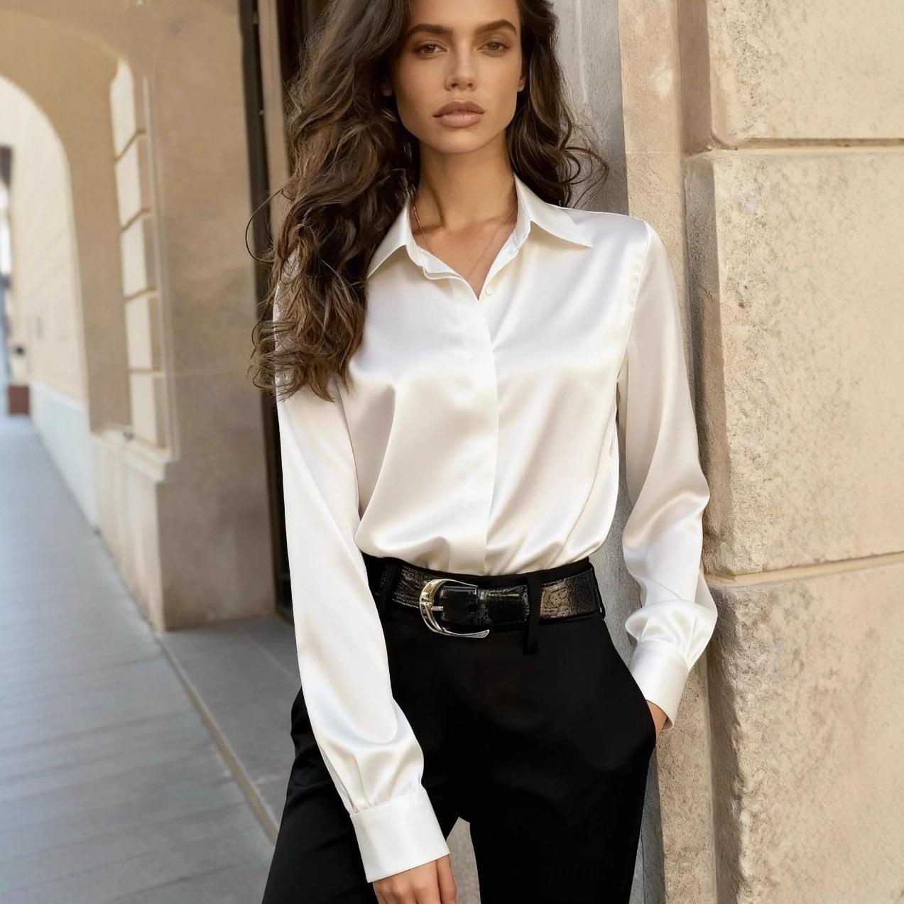 • Women's Satin Shirt Elegant Long Sleeve Lapel Button Down Silk Texture Blouse Office Commuting Professional Solid Color Top For Ladies