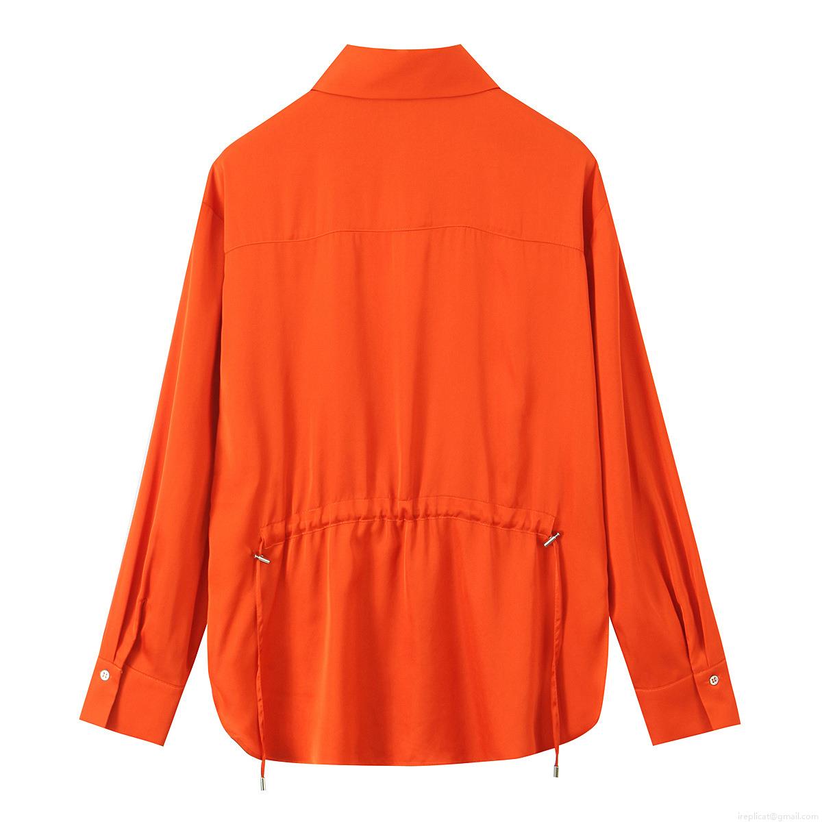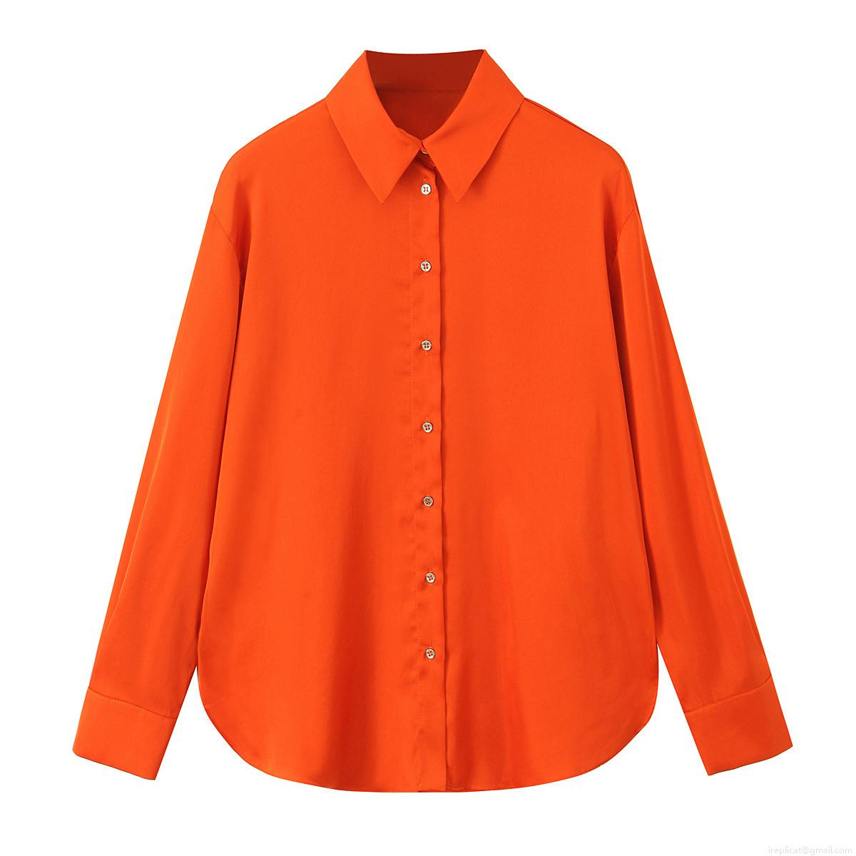• Women's Satin Silky Long Sleeve Blouse Fashionable Orange Lapel Collar Button Up Shirt With Drawstring Back Casual Office Party Plain Tops