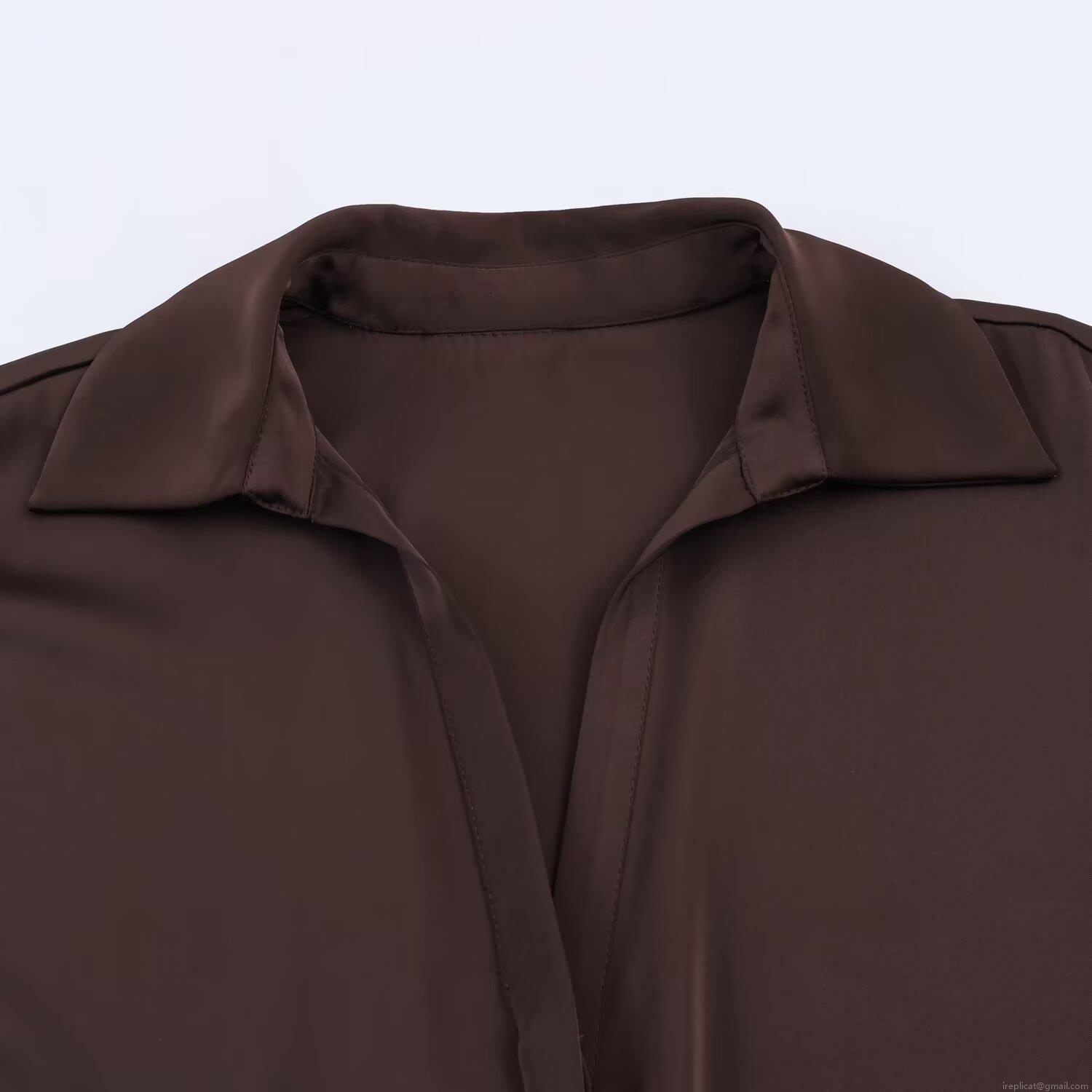 Women's Satin Texture Blouse Long Sleeve Lapel V-Neck Shirt With Waist Belt Elegant Coffee Color Solid Casual Tops For Office Daily Wear Autumn Winter