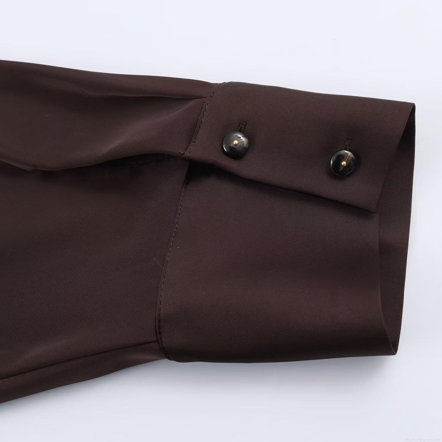 • Women's Satin Texture Blouse Long Sleeve Lapel V-Neck Shirt With Waist Belt Elegant Coffee Color Solid Casual Tops For Office Daily Wear Autumn Winter