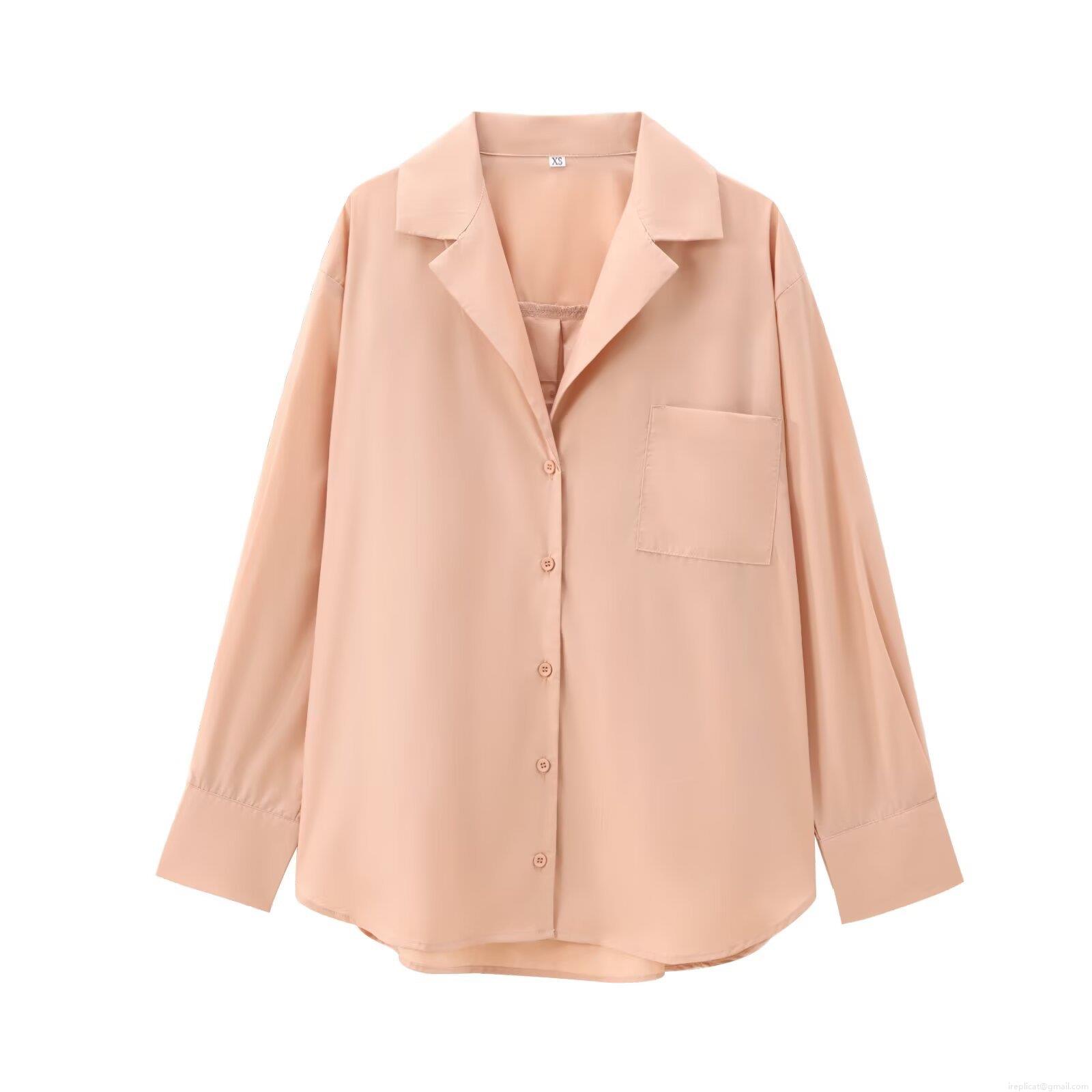 • Women's Satin Texture Poplin Shirt Long Sleeve Button Down Blouse Solid Color Lapel Collar Top with Front Pocket for Casual Office Daily Wear