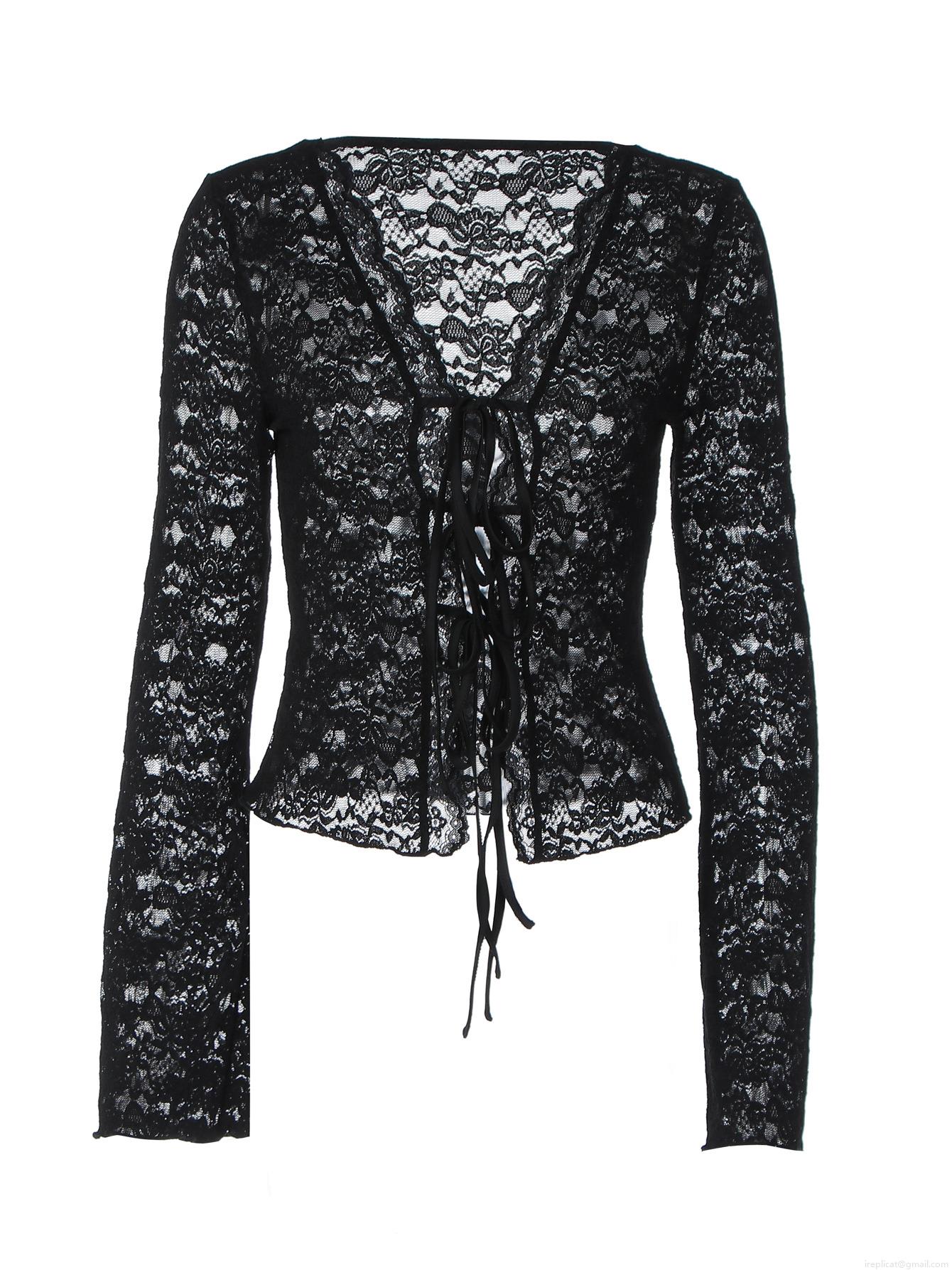 • Women's Sexy Black Lace Hollow Out Cardigan Top V Neck Tie-Up Long Flare Sleeve See-Through Blouse Streetwear Y2K Slim Fit T-Shirt