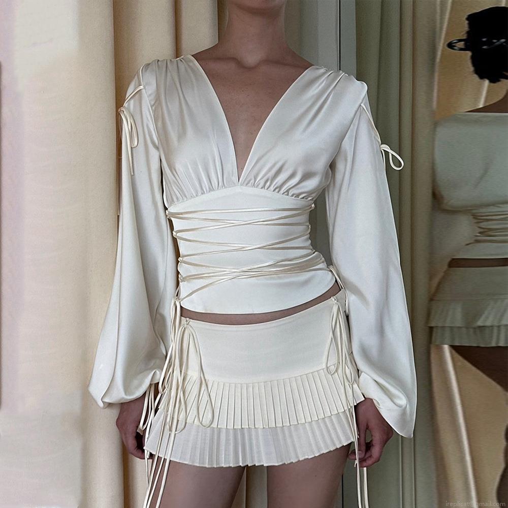 Women's Sexy Satin Top Deep V Neck Long Sleeve Tie Up Blouse Solid Color Slim Fit Polyester Streetwear Autumn T-Shirt For Women Clubwear Party Fashion