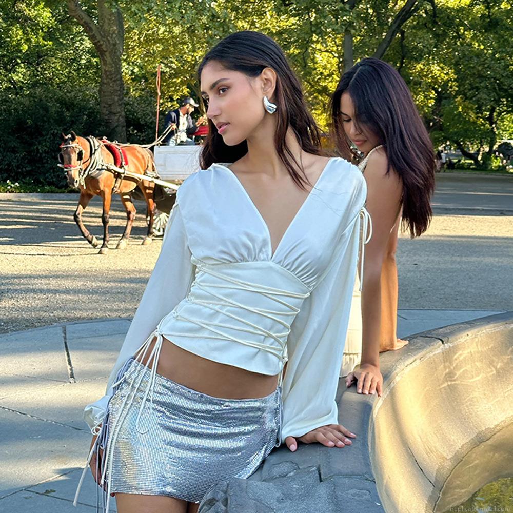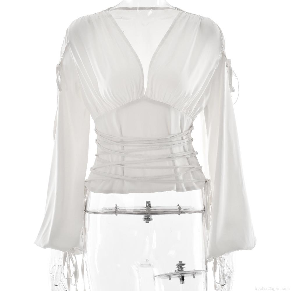 • Women's Sexy Satin Top Deep V Neck Long Sleeve Tie Up Blouse Solid Color Slim Fit Polyester Streetwear Autumn T-Shirt For Women Clubwear Party Fashion