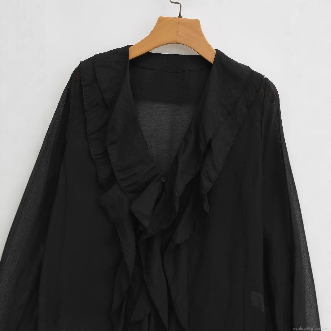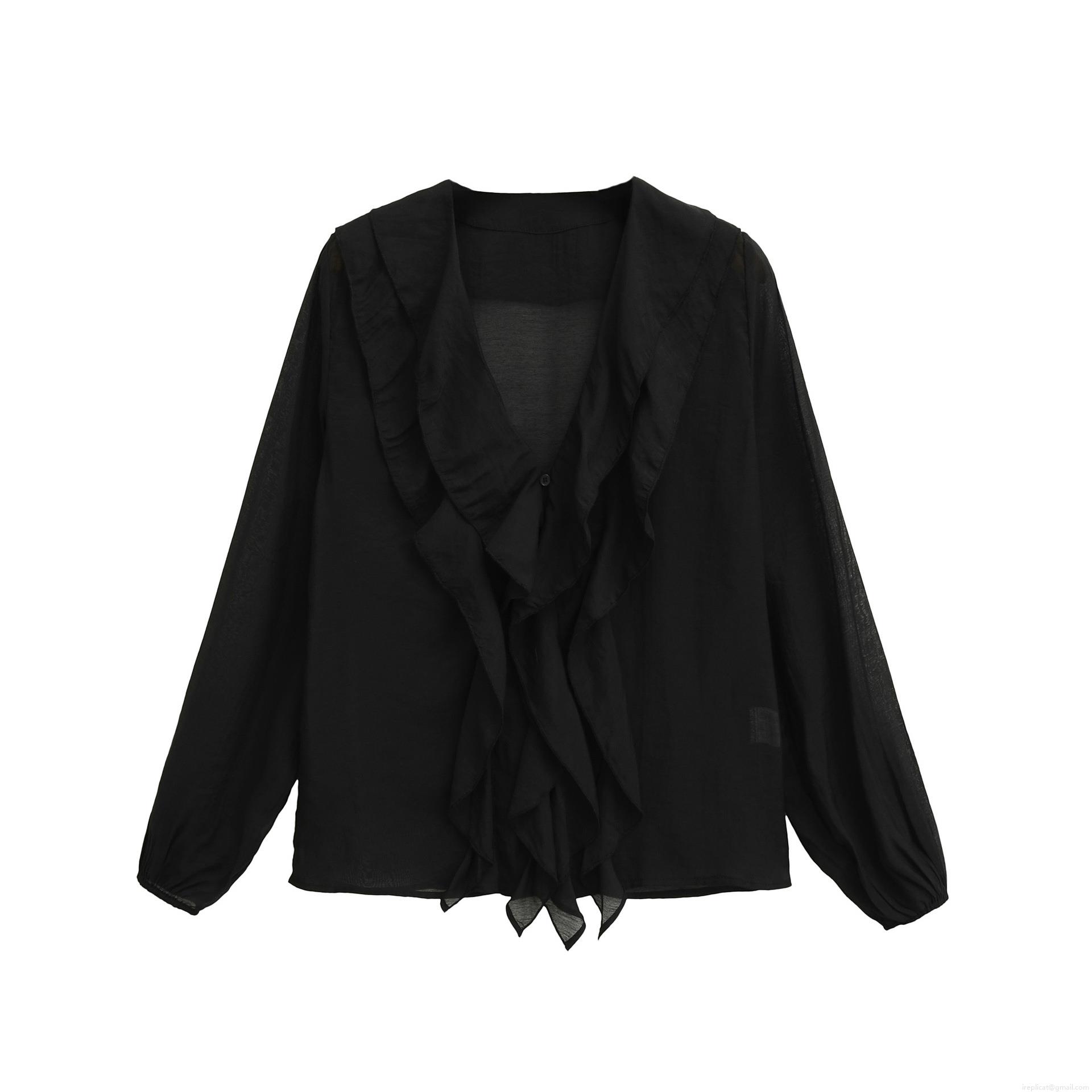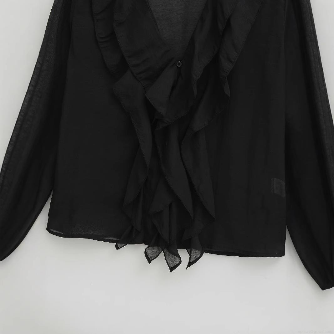 Women's Sexy V-Neck Chiffon Blouse Elegant Long Sleeve Ruffle Shirt With Backless Sheer Design Solid Color Black Tops For Party Dating