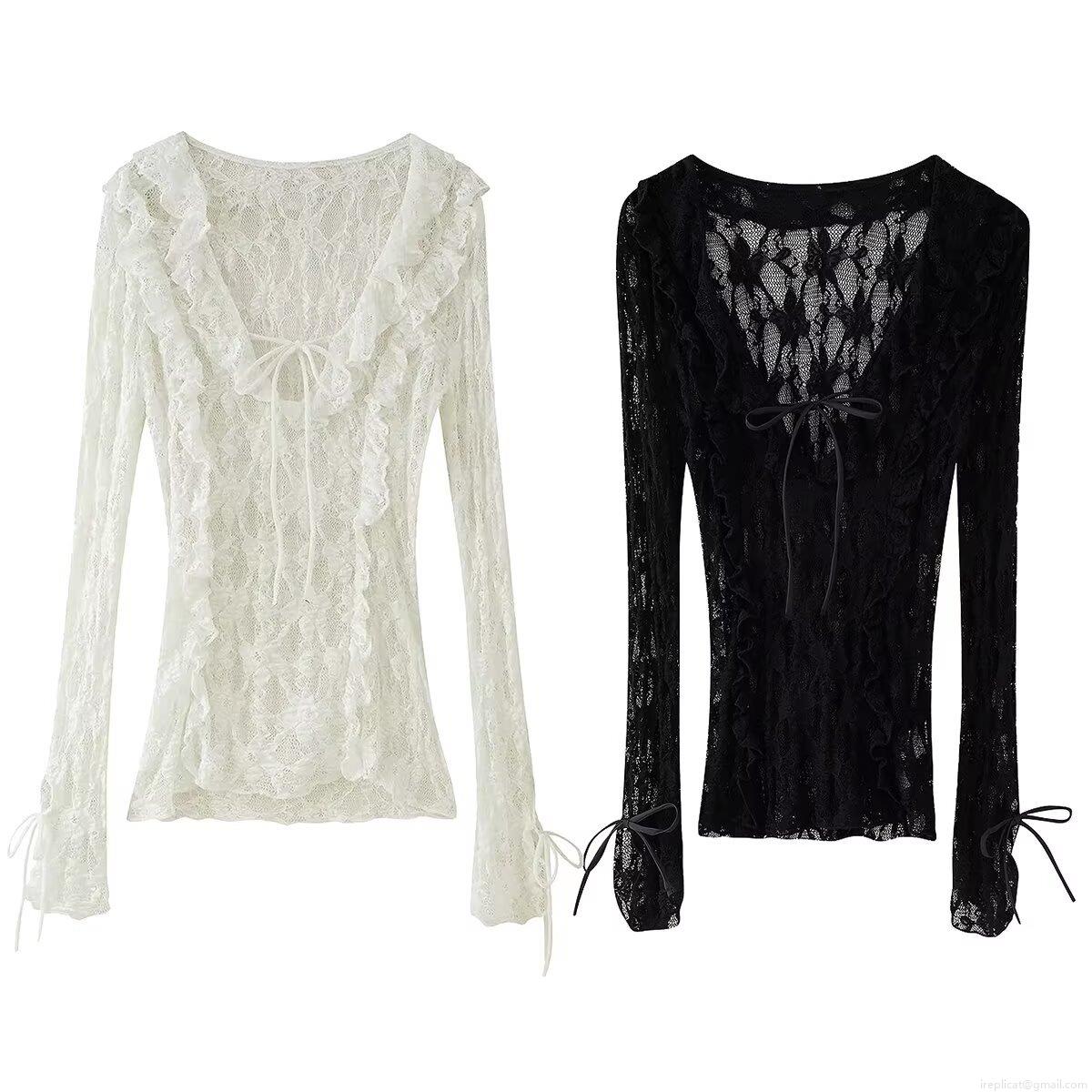 Women's Sexy V-Neck Lace Blouse Long Sleeve Ruffle Tie Hollow Out Mesh Top Elegant Sweet French Style Sheer Pullover Shirt for Daily Party