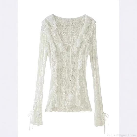 • Women's Sexy V-Neck Lace Blouse Long Sleeve Ruffle Tie Hollow Out Mesh Top Elegant Sweet French Style Sheer Pullover Shirt for Daily Party