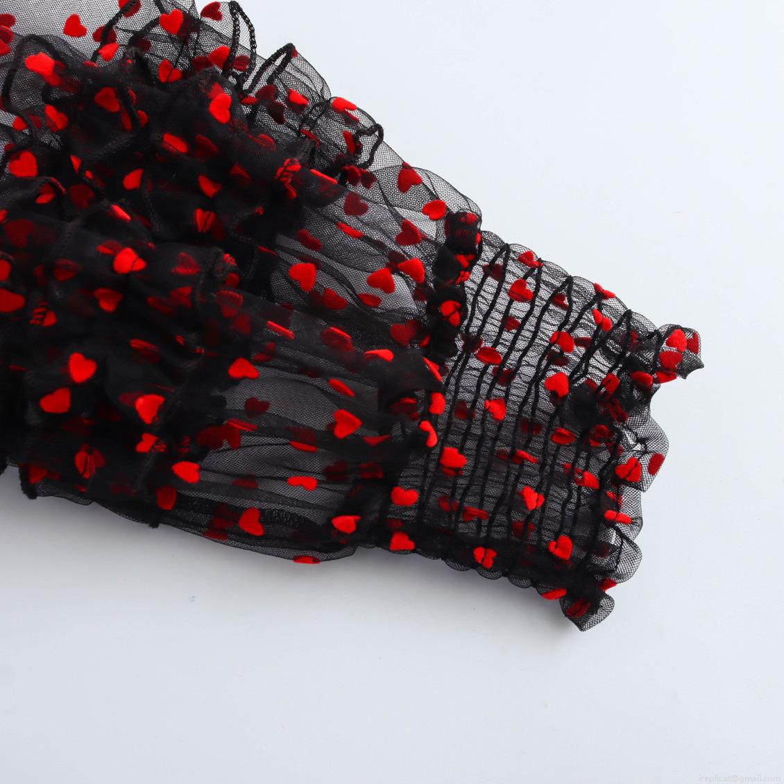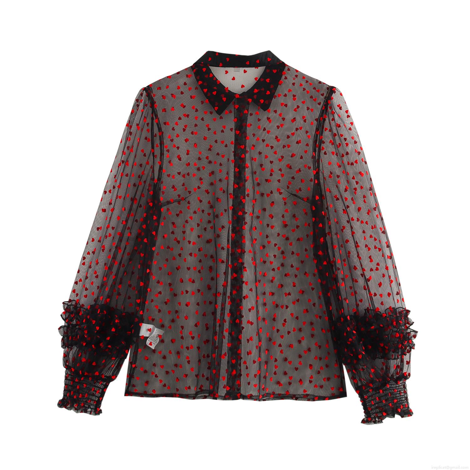 Women's Sheer Mesh Blouse Red Flocked Heart Pattern Shirt Lantern Sleeve Ruffle Cuff Button Down Sweet Sexy See Through Top For Women