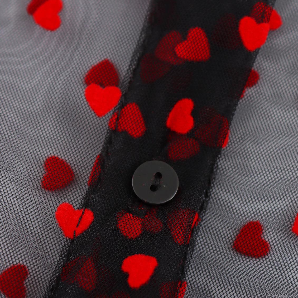 • Women's Sheer Mesh Blouse Red Flocked Heart Pattern Shirt Lantern Sleeve Ruffle Cuff Button Down Sweet Sexy See Through Top For Women
