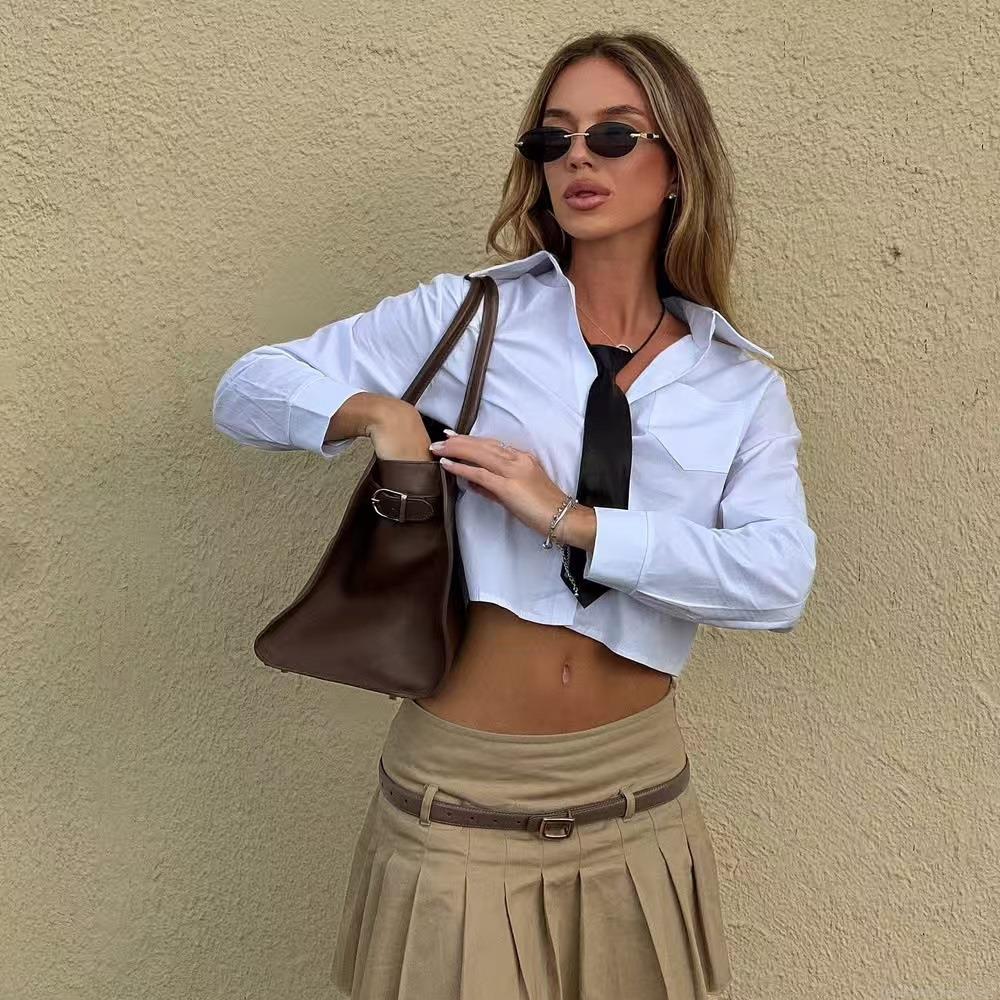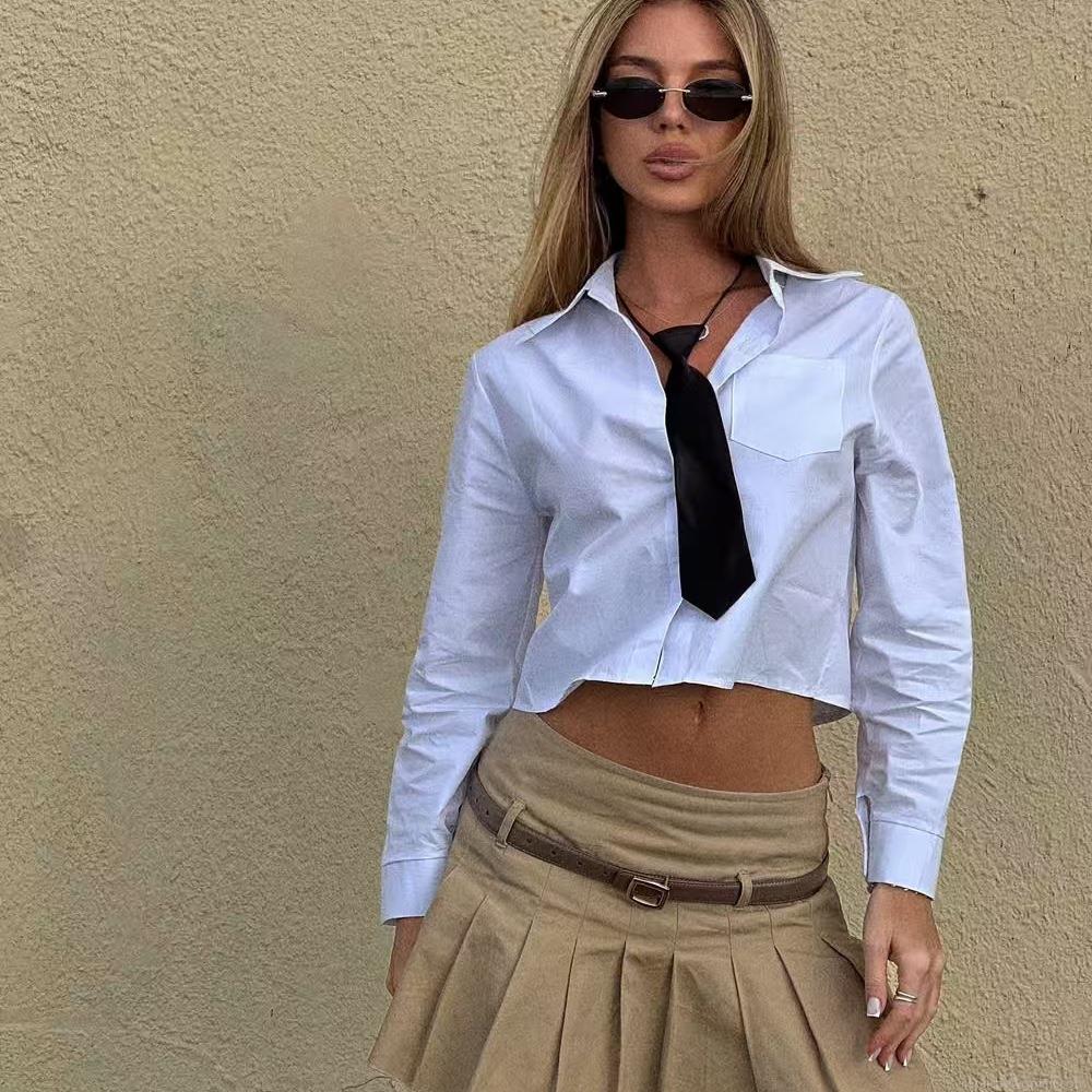• Women's Short Crop Shirt With Tie Long Sleeve Lapel Collar Blouse Streetwear Sexy Solid Color Polyester Blend Top For Women Daily Fashion