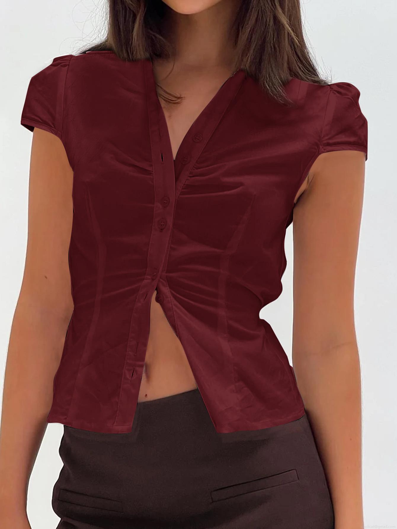 • Women's Short Sleeve Button Up Blouse Ruched V Neck Shirt Sexy Y2K Spicy Girl Top Solid Color Casual Summer Outfits Polyester Blouse