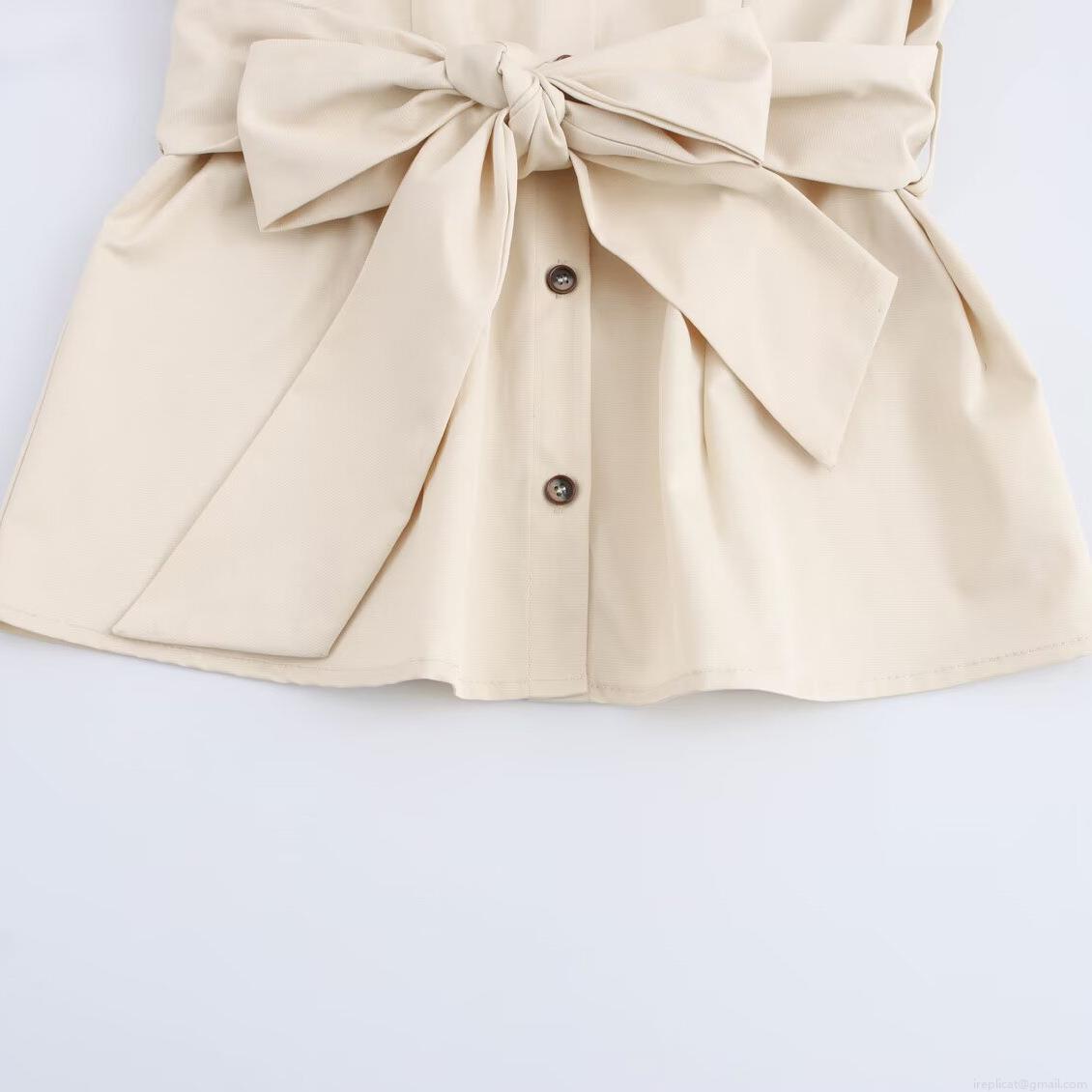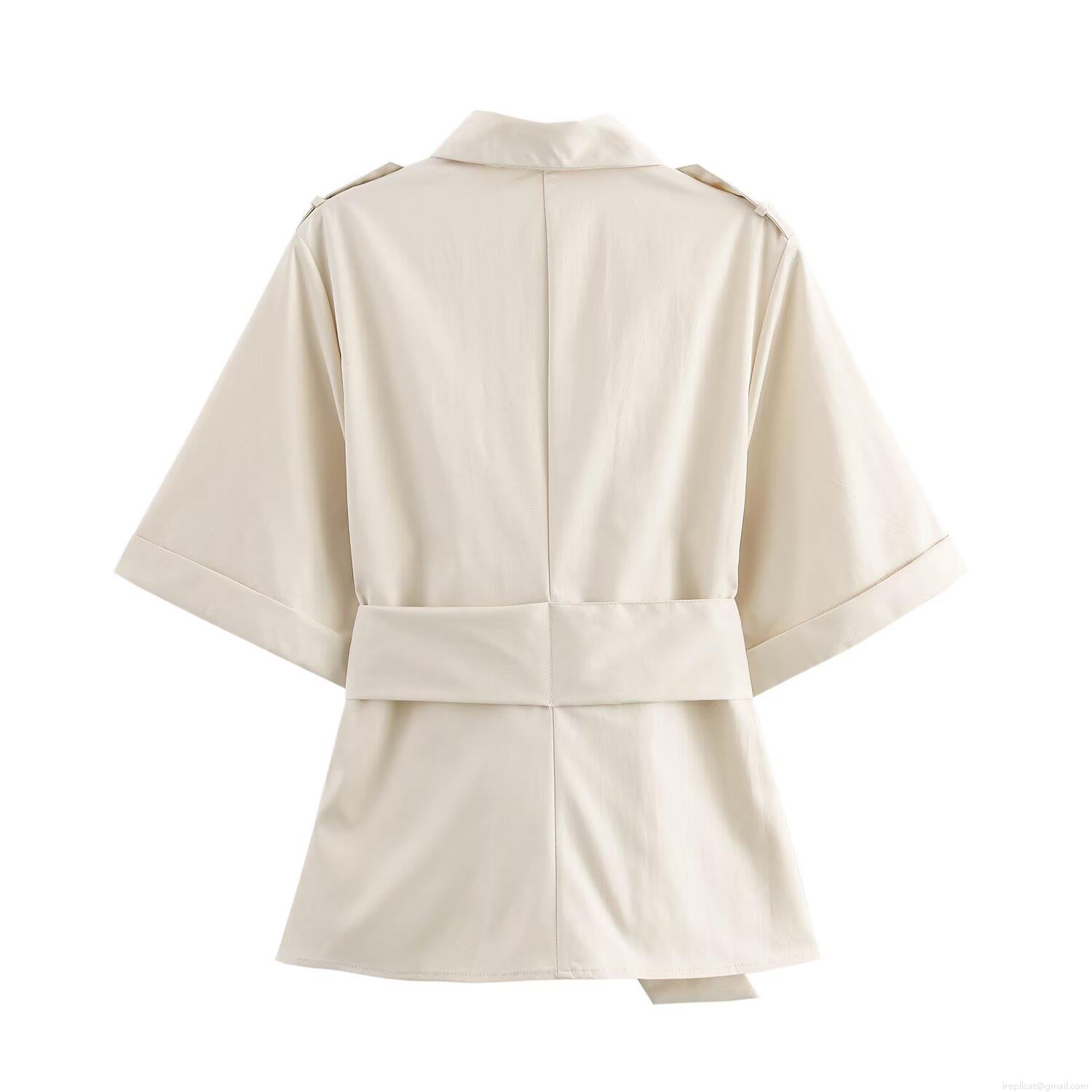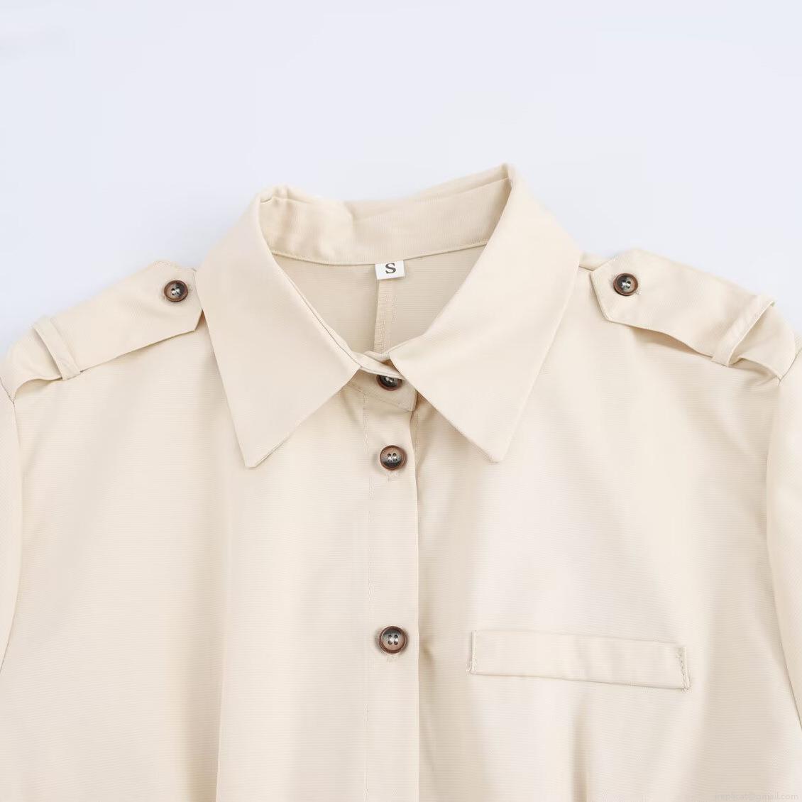 • Women's Short Sleeve Khaki Blouse With Waist Belt Bow Tie Lapel Twill Shirt Single Breasted Workwear Style Top With Shoulder Tabs For Office Casual Daily