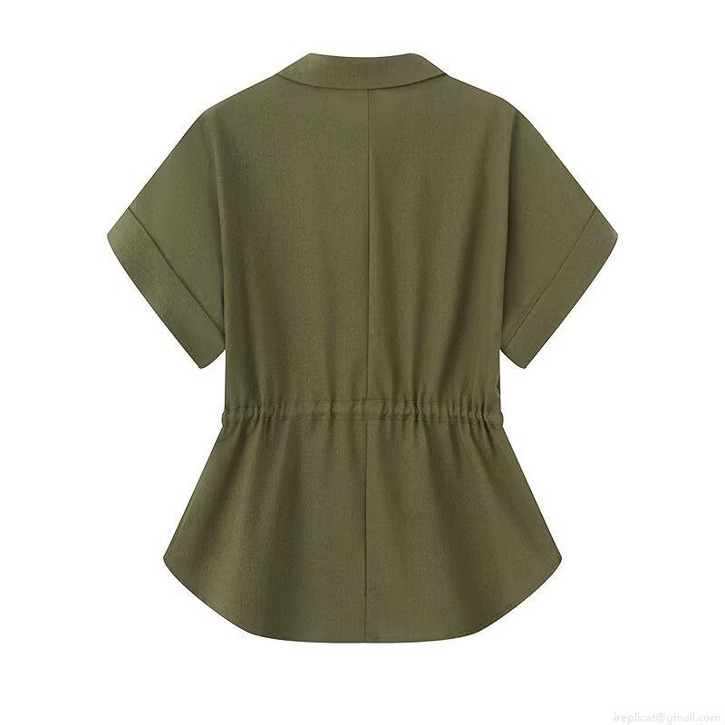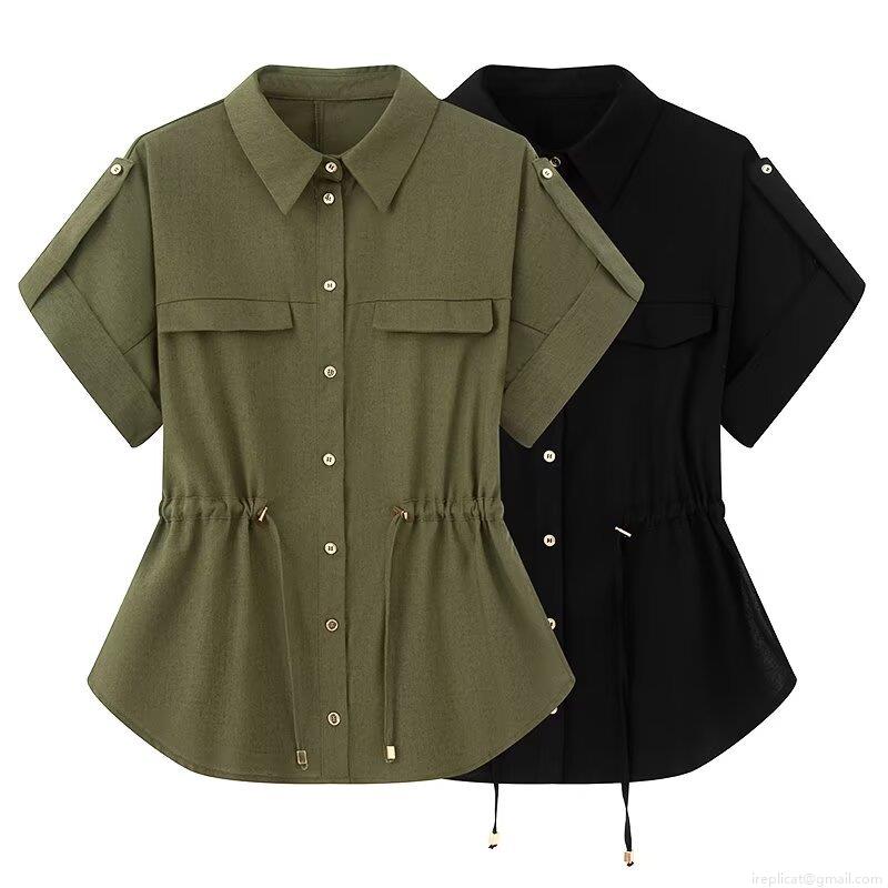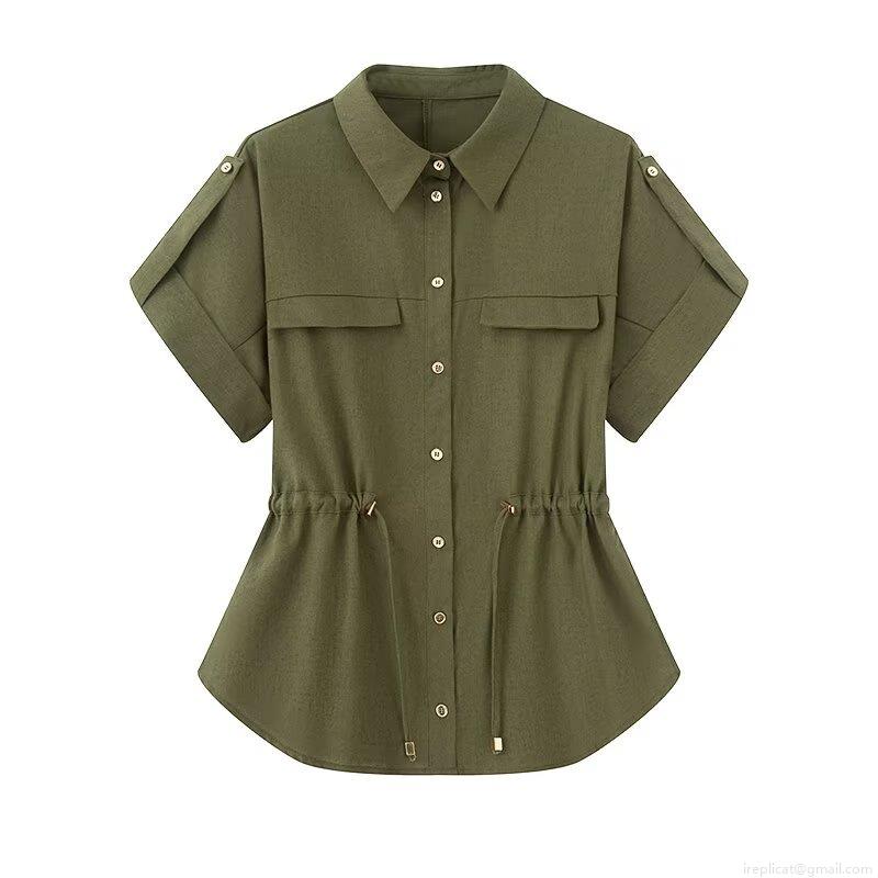 • Women's Short Sleeve Linen Blend Shirt Fashion Versatile Button Down Blouse With Drawstring Waist Double Chest Pockets Safari Style Summer Casual Top