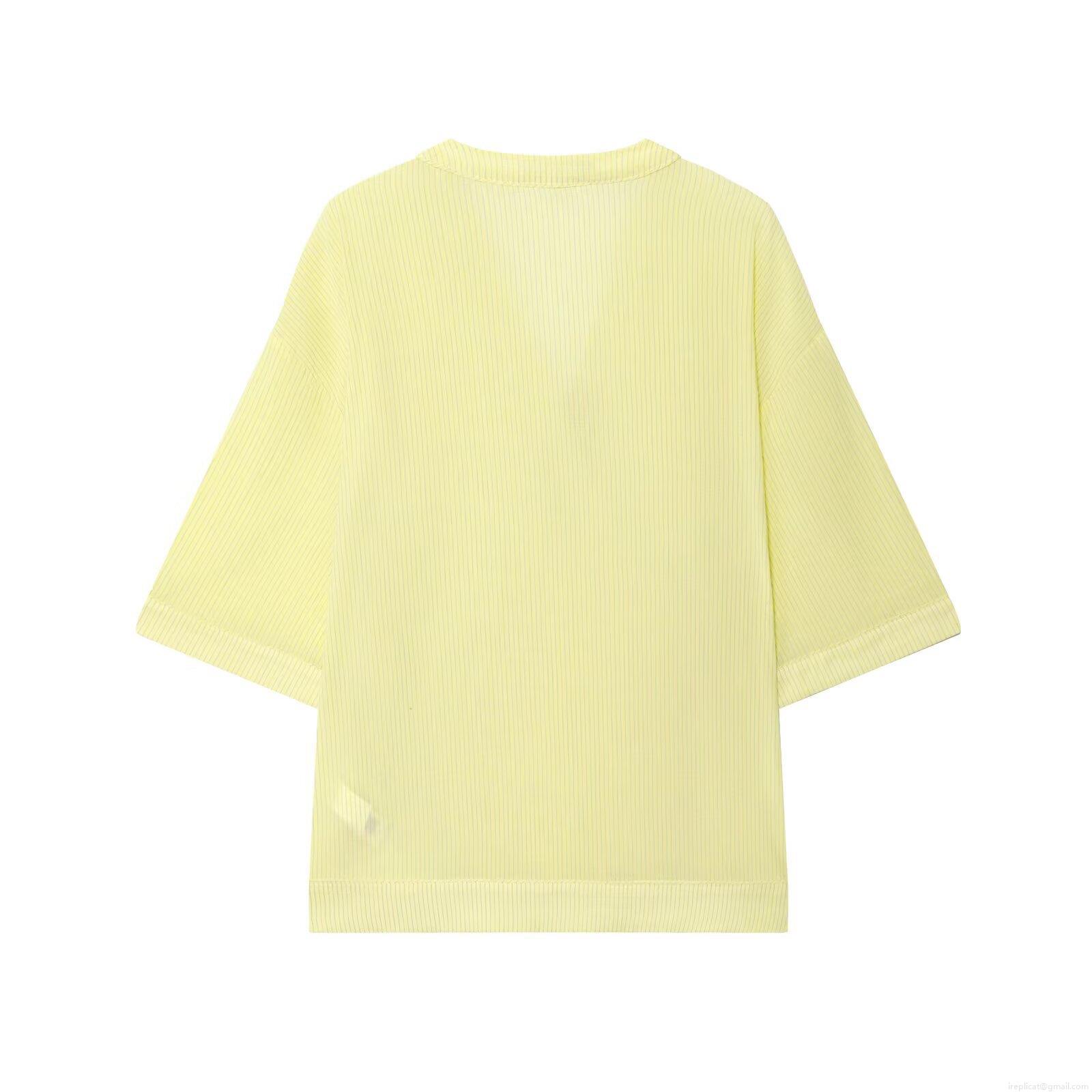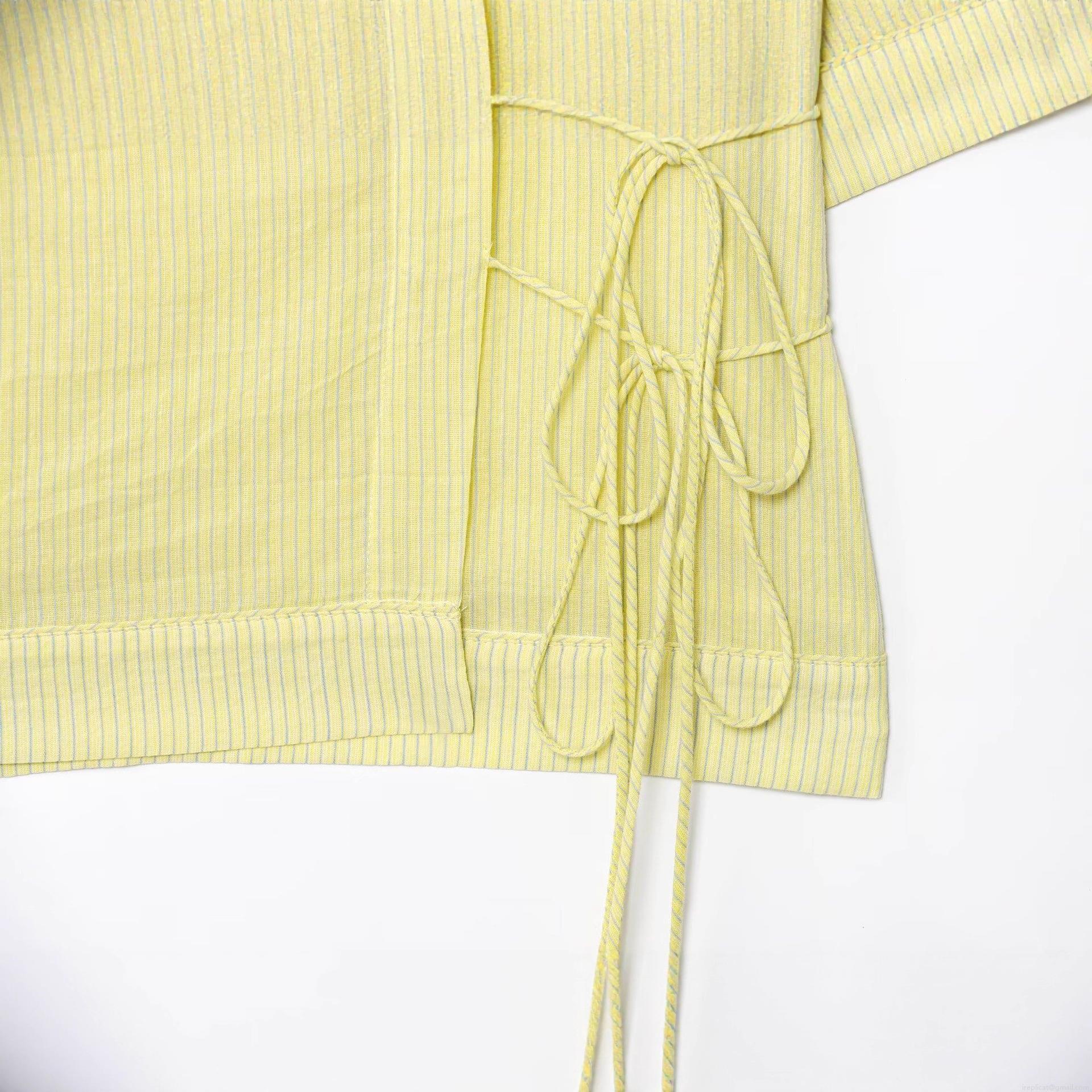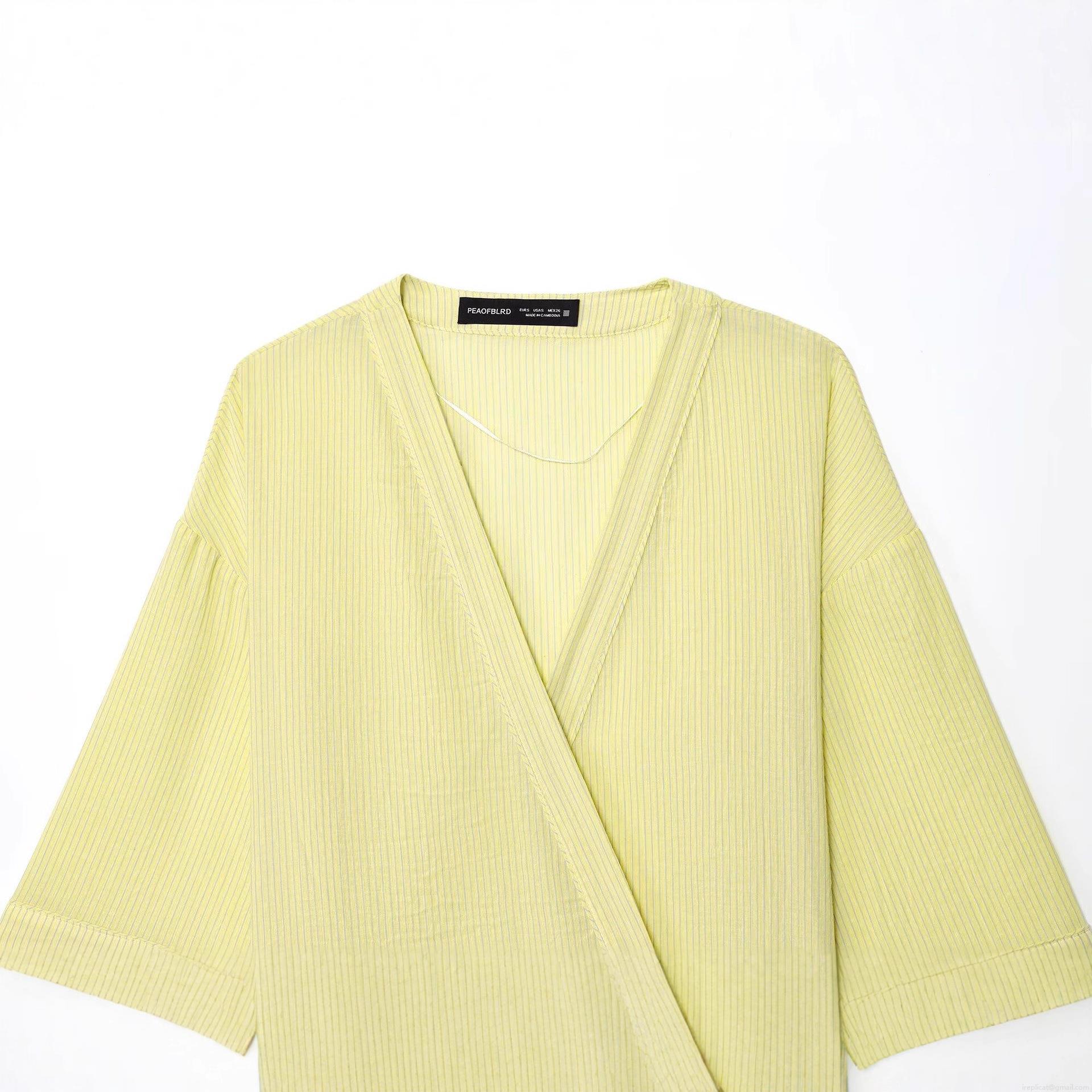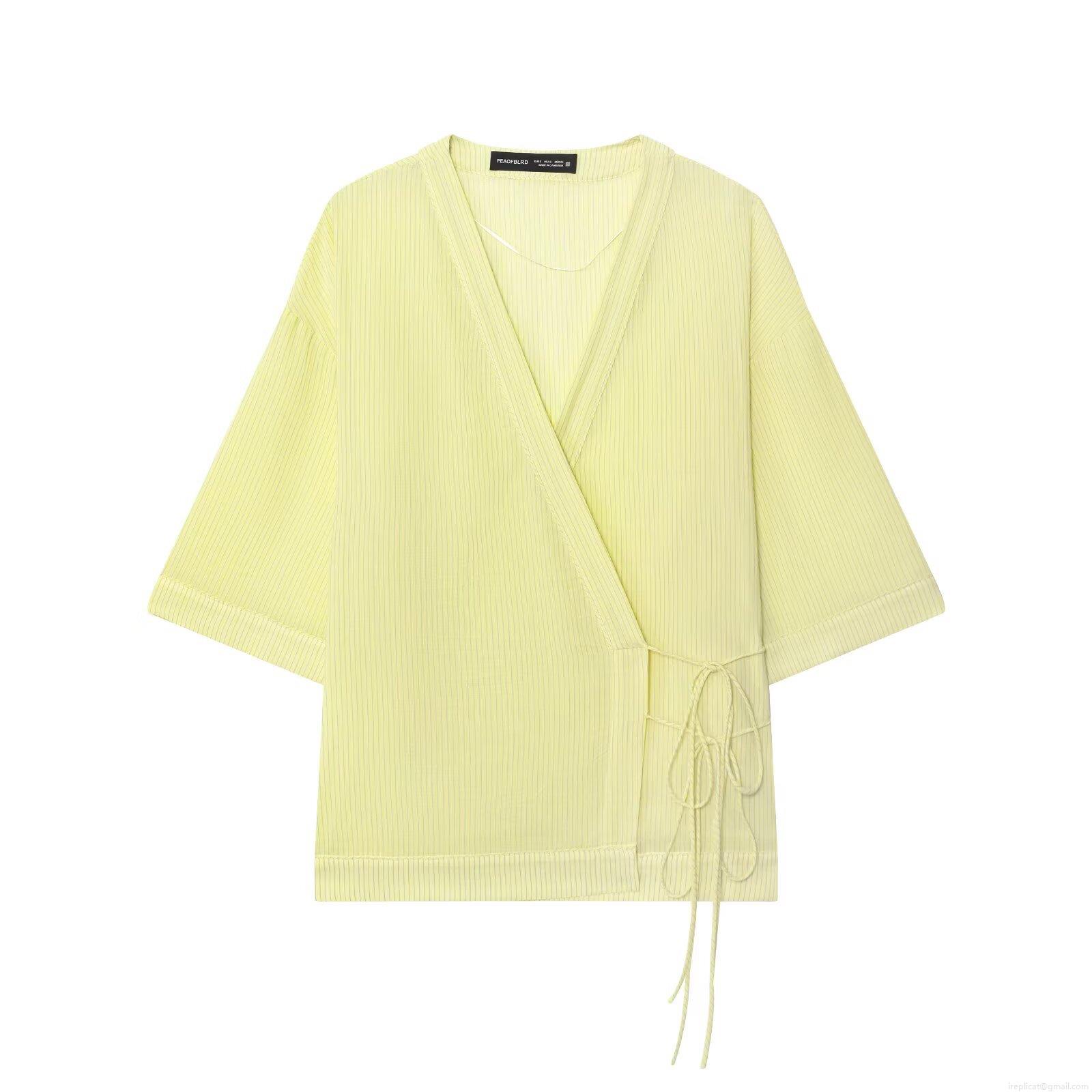 • Women's Short Sleeve V-Neck Striped Wrap Shirt Casual Slub Cotton Kimono Style Blouse With Side Tie Bow For Summer Vacation Breathable Lightweight Tops
