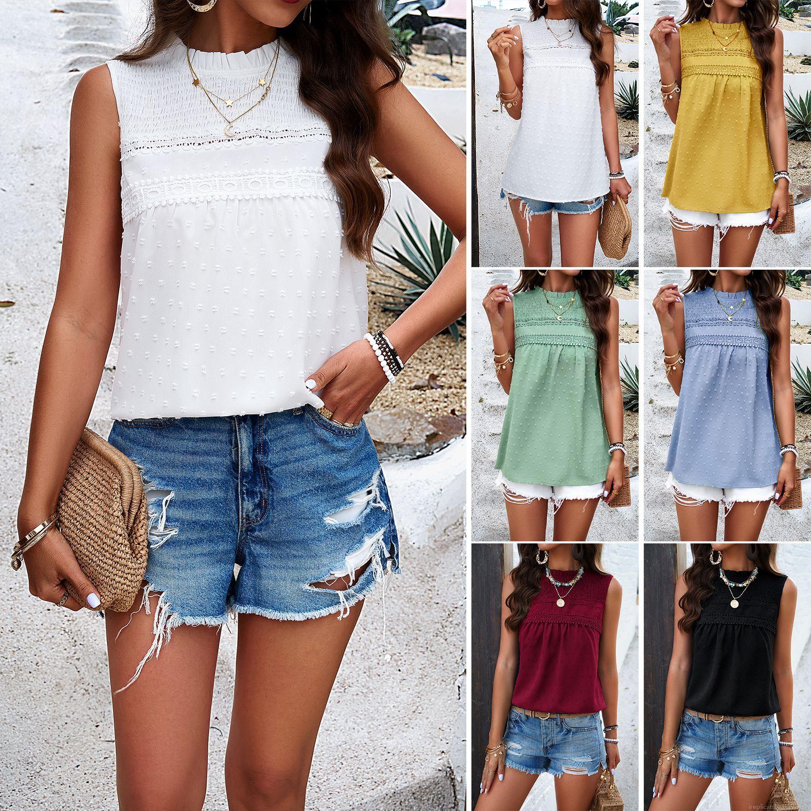 • Women's Sleeveless Blouse Mock Neck Swiss Dot Lace Trim Summer Tank Top Casual Loose Shirt For Vacation Work Office Ladies 100% Polyester