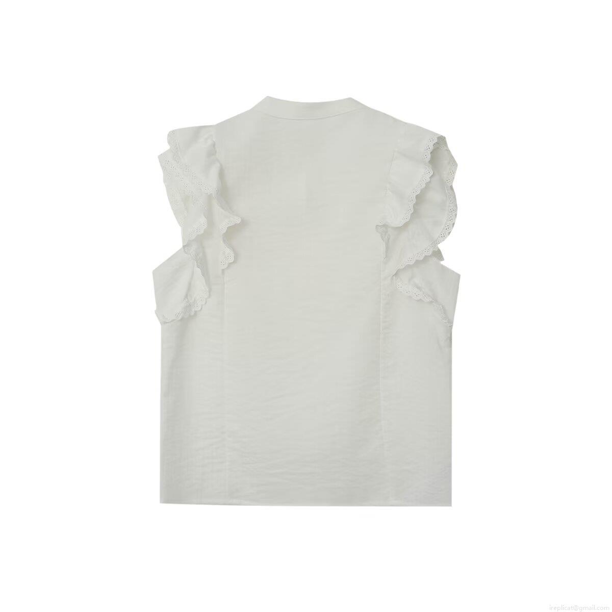 • Women's Sleeveless Blouse Round Neck Flutter Sleeves Pleated Lace Embroidery Solid White Summer Casual Top European American Style Women's Clothing