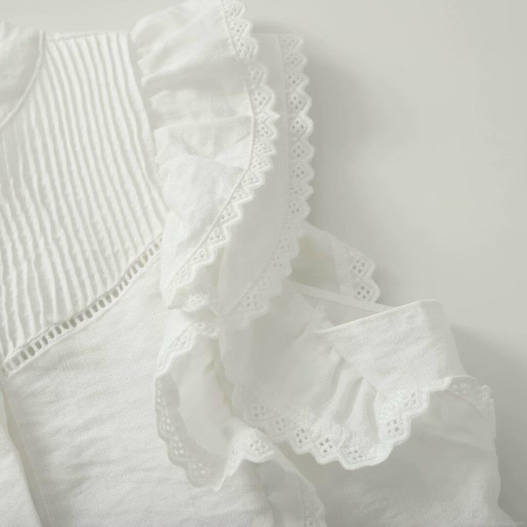 Women's Sleeveless Blouse Round Neck Flutter Sleeves Pleated Lace Embroidery Solid White Summer Casual Top European American Style Women's Clothing
