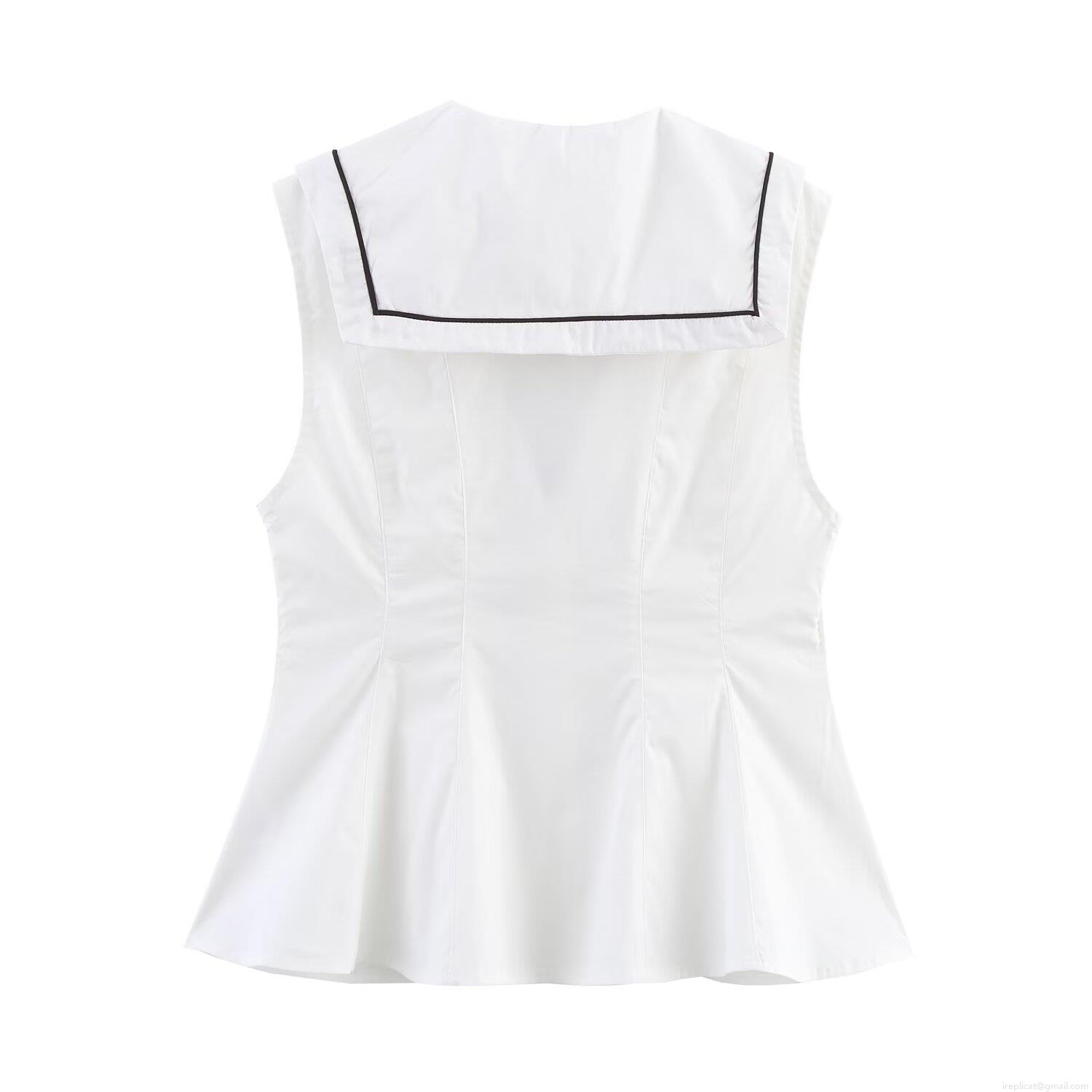 Women's Sleeveless Bow Trim Poplin Top Sweet Sailor Collar Contrast Piping Slim Fit Summer Blouse INS Fashion Elegant White Top