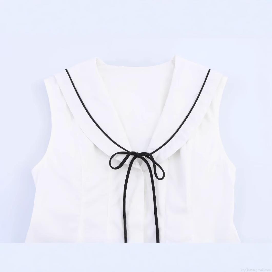 • Women's Sleeveless Bow Trim Poplin Top Sweet Sailor Collar Contrast Piping Slim Fit Summer Blouse INS Fashion Elegant White Top