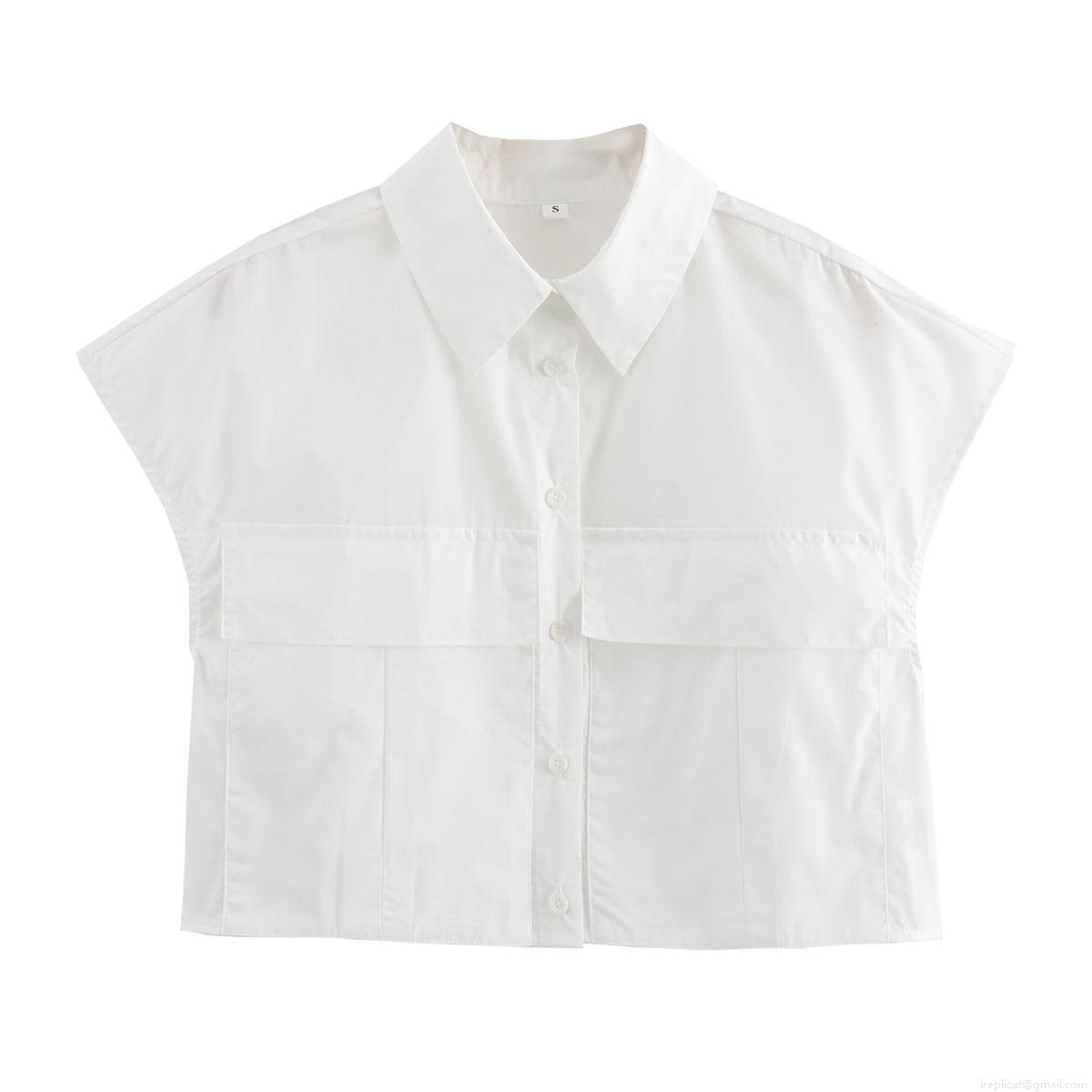 • Women's Sleeveless Crop Shirt Solid Color Polyester Button Down Blouse Top With Flap Pockets Casual Workwear Style Summer Outfits For Women