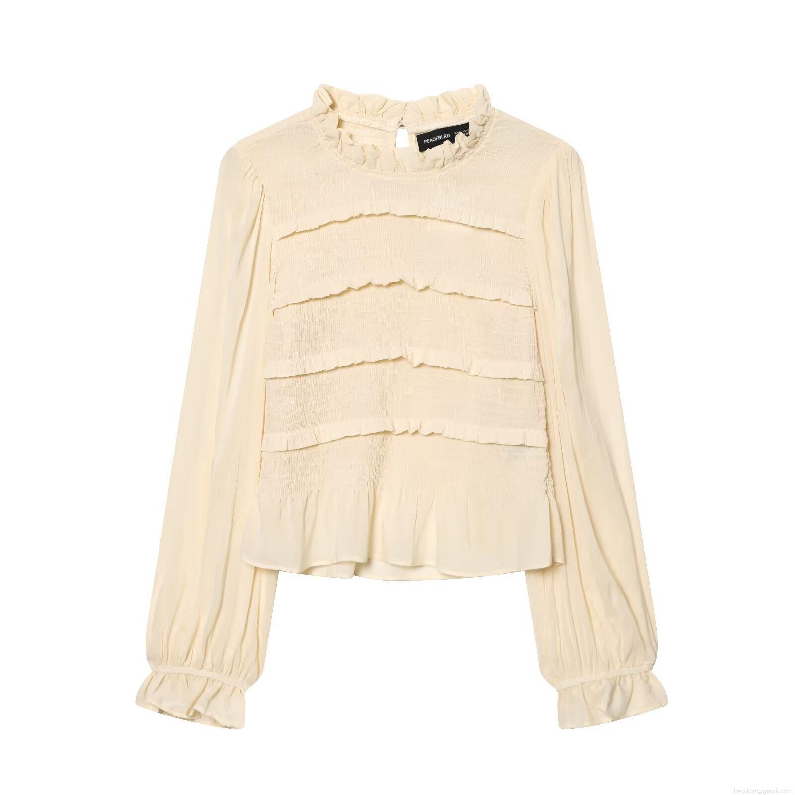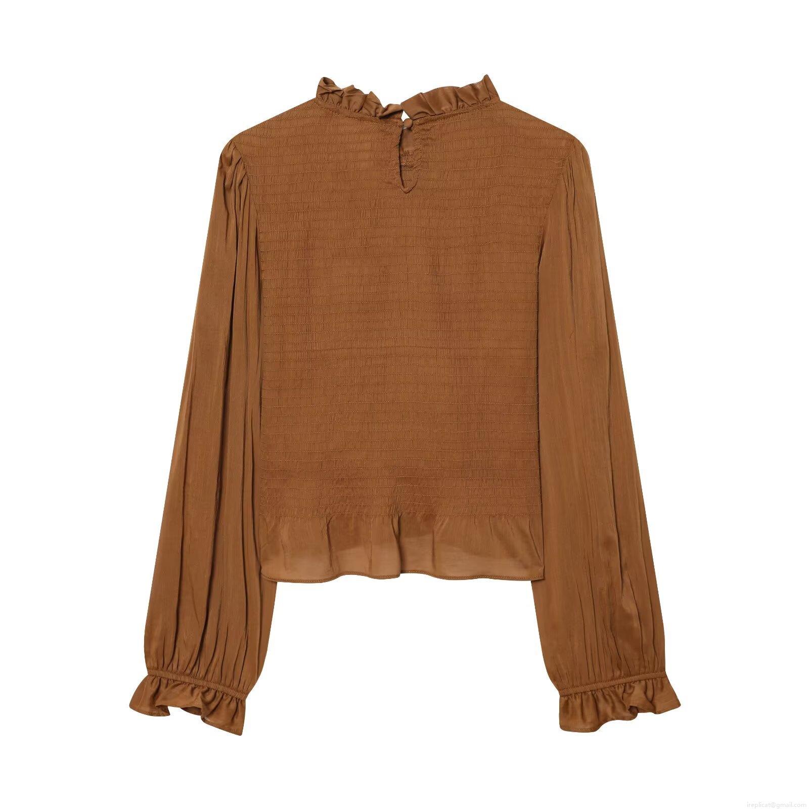 • Women's Smocked Blouse Ruffle Trim Stand Collar Long Sleeve Cotton Blend Shirt Elegant Solid Color Slim Fit Pullover Top For Party Daily Dating